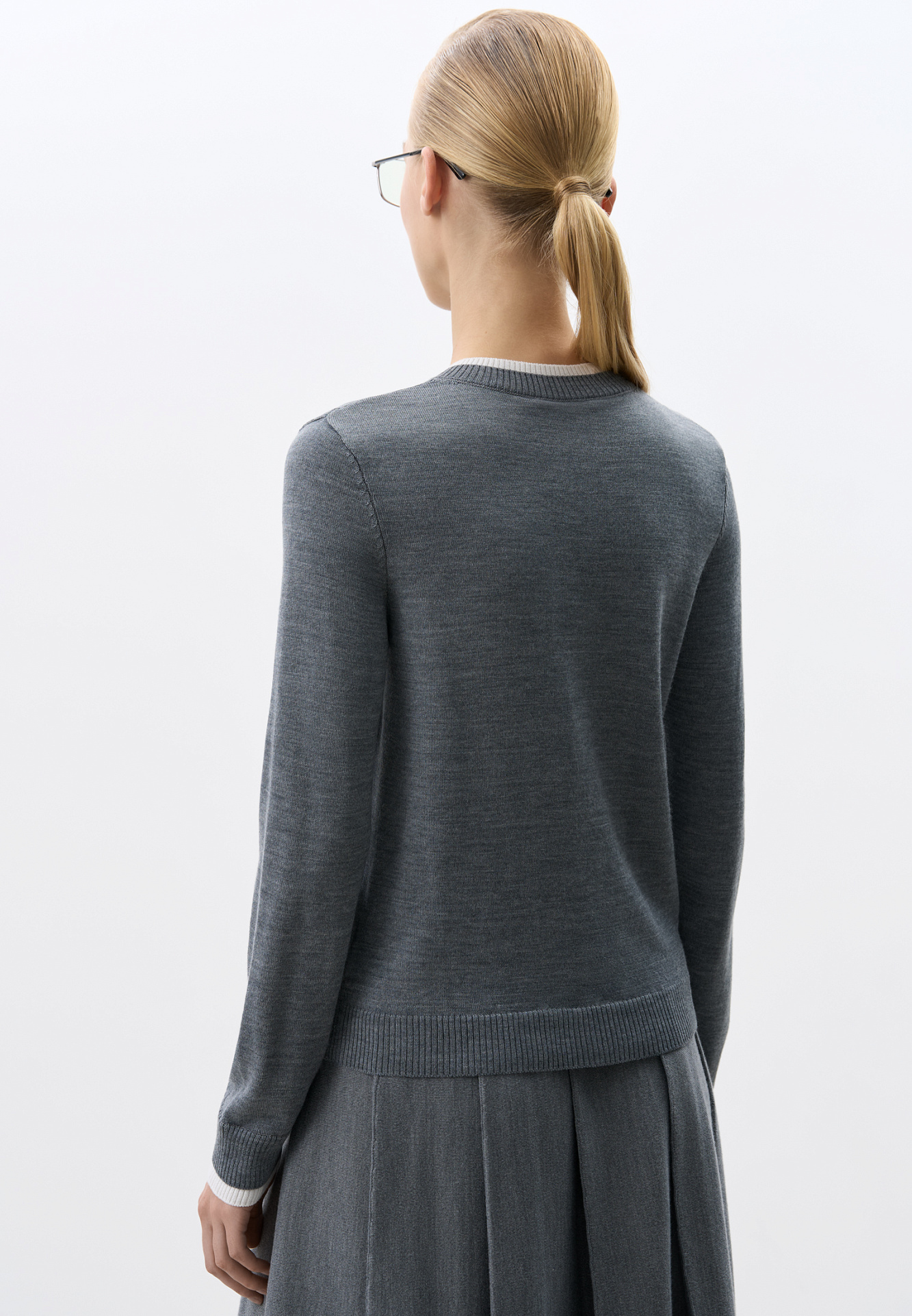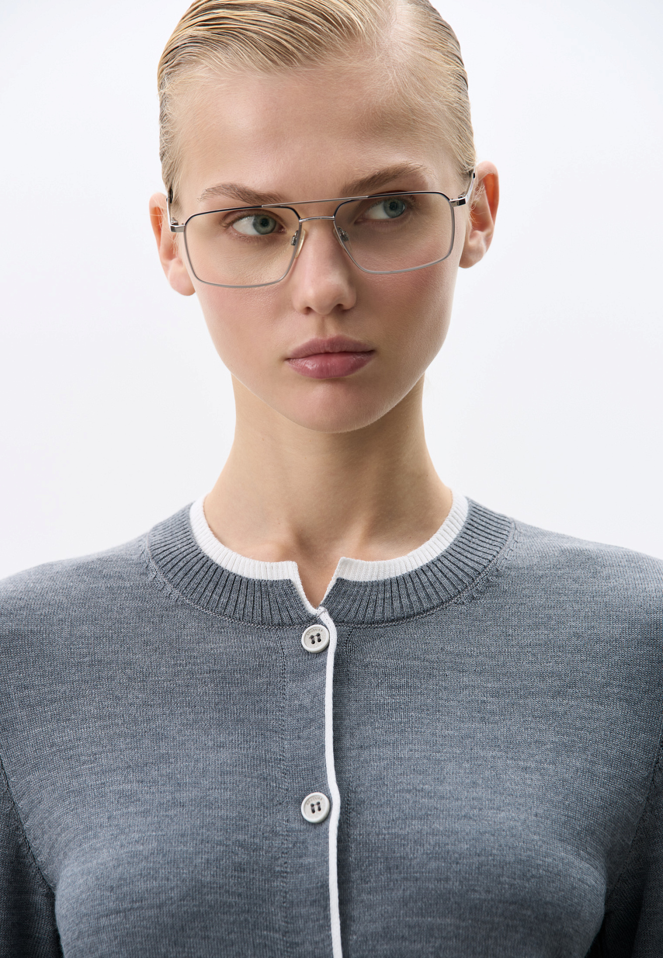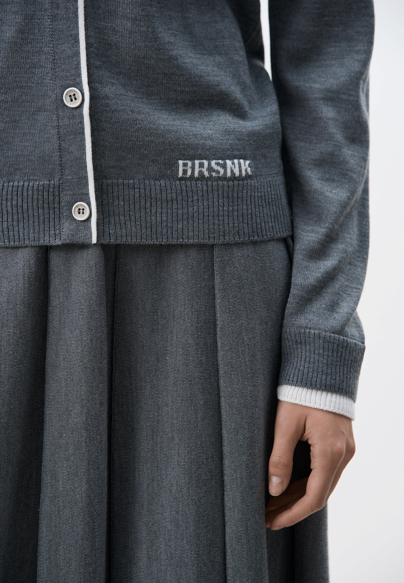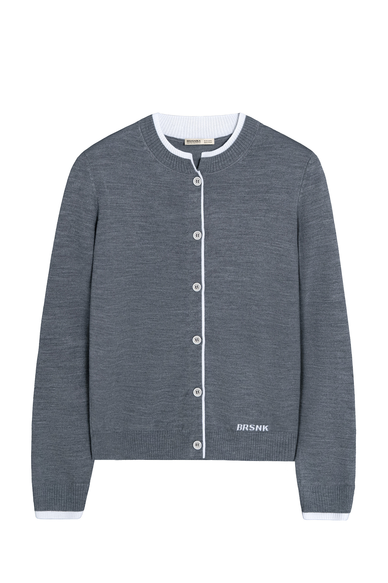 Трикотажный кардиган из шерсти с добавлением акрила. Модель свободного силуэта с контрастными манжетами и воротничком. Изделие декорировано брендированным жаккардом. Застежка на пуговицы.
