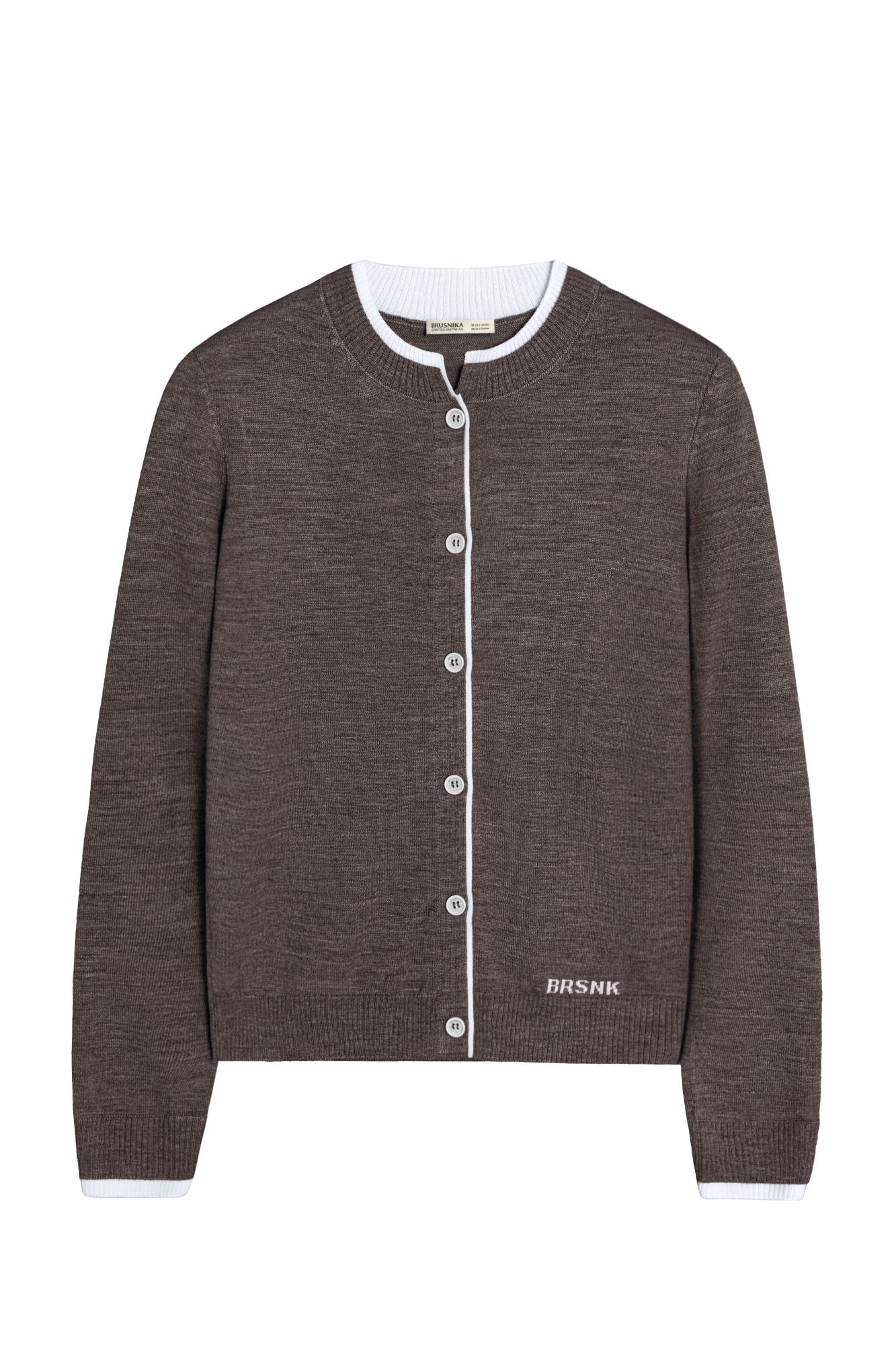 Трикотажный кардиган из шерсти с добавлением акрила. Модель свободного силуэта с контрастными манжетами и воротничком. Изделие декорировано брендированным жаккардом. Застежка на пуговицы.