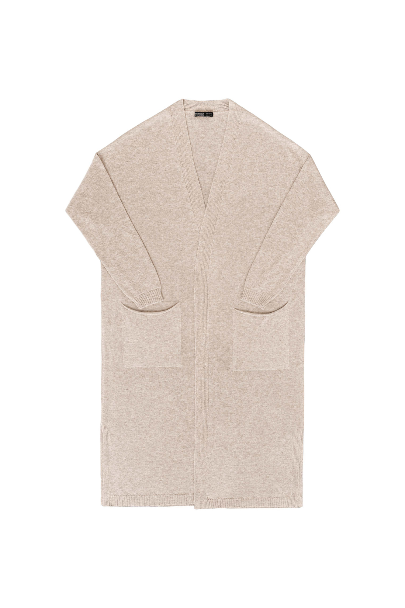 Длинный трикотажный кардиган из вискозы. Модель прямого кроя, с двумя боковыми карманами, шлевками на талии и поясом.