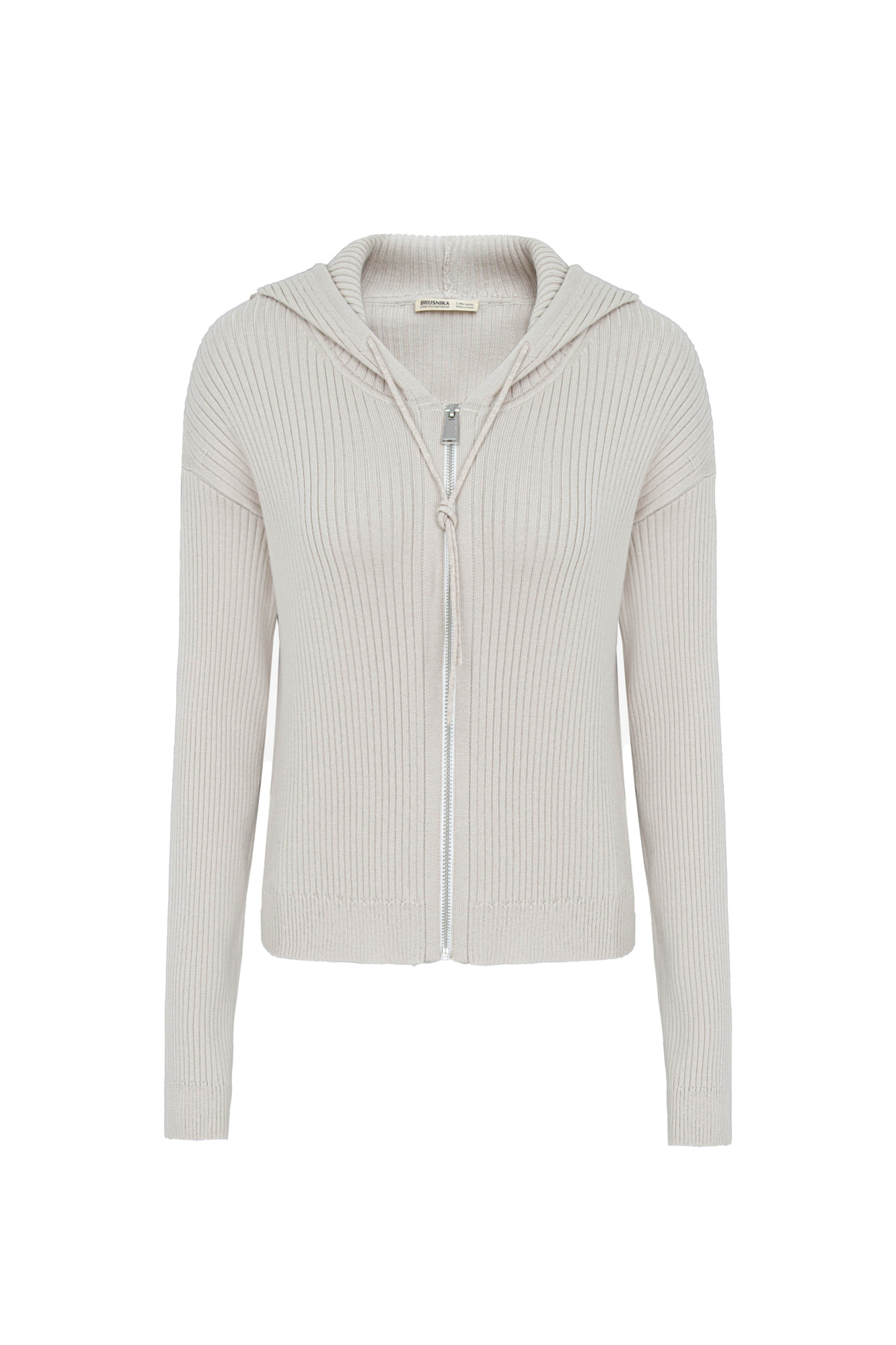 Трикотажный бомбер в рубчик. Модель приталенного силуэта, с длинными рукавами, спущенной линией плеч и капюшоном на кулиске. Застежка на молнию.