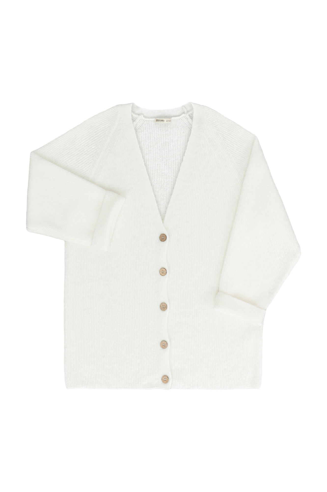 Трикотажный кардиган из шерсти альпака. Модель свободного силуэта со спущенным плечом. Застежка на пуговицы.
