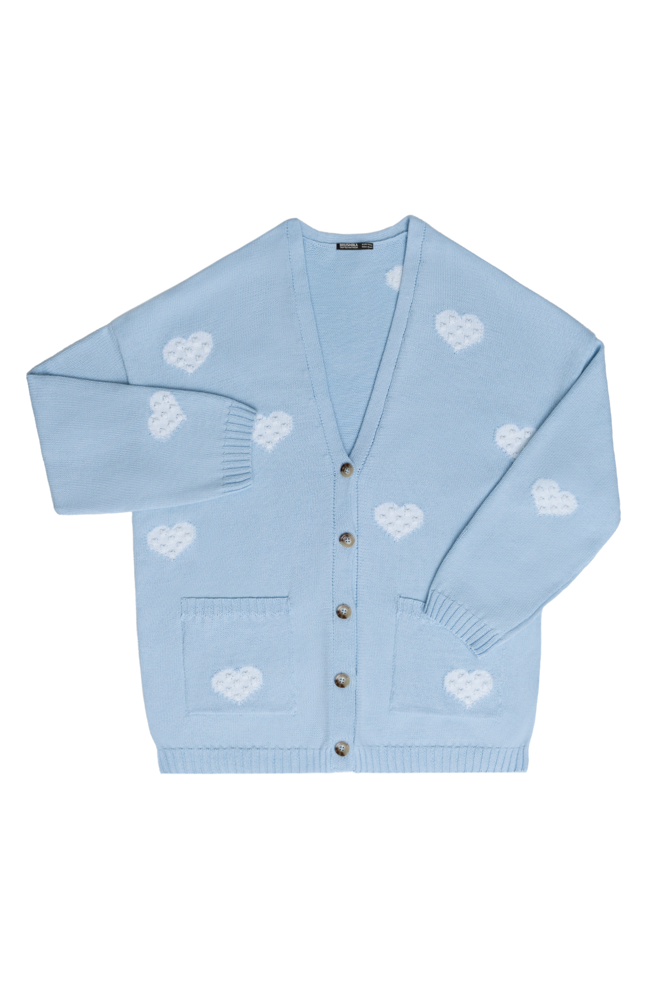 Свободный кардиган с V-образным вырезом и вывязанными сердцами. Застежка на пуговицы.