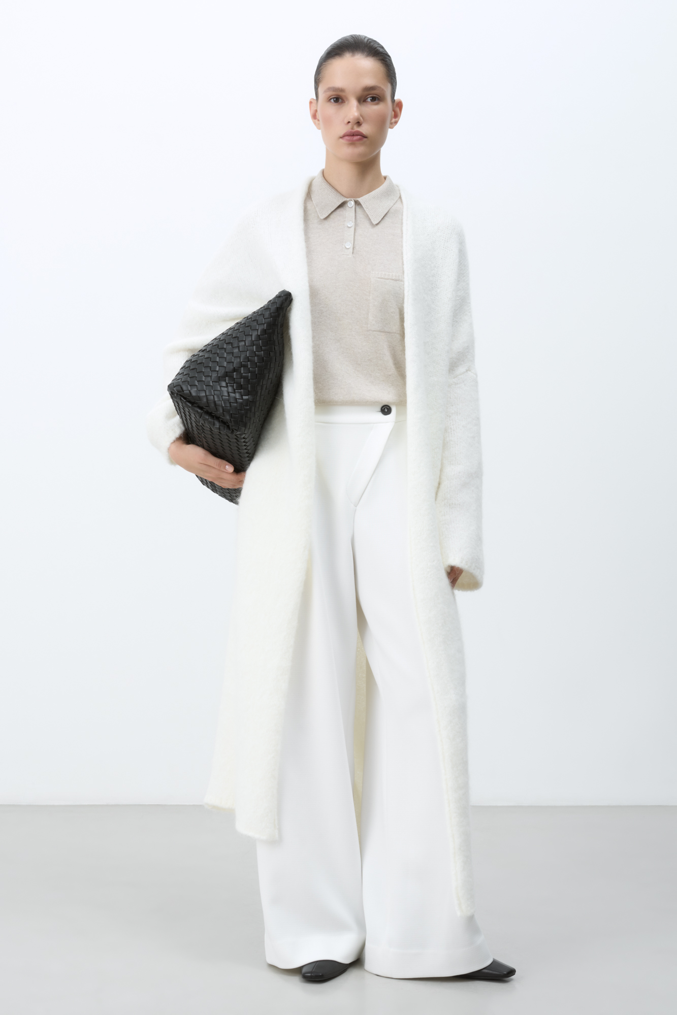Длинный трикотажный кардиган из шерсти с добавлением мохера. Модель прямого кроя, с длинными свободными рукавами, воротником стойкой, шлевками на талии и поясом.