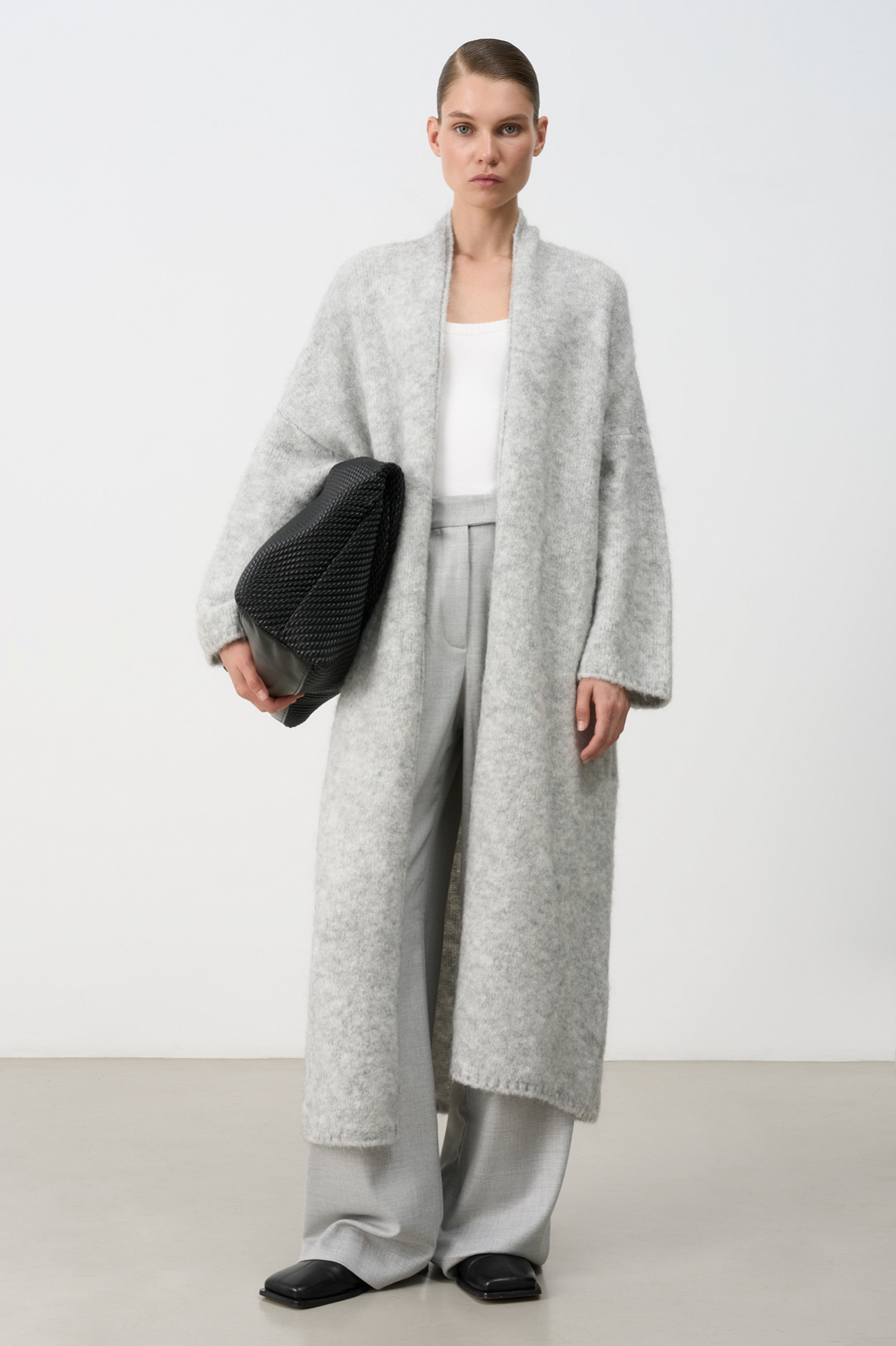 Длинный трикотажный кардиган из шерсти с добавлением мохера. Модель прямого кроя, с длинными свободными рукавами, воротником стойкой, шлевками на талии и поясом.