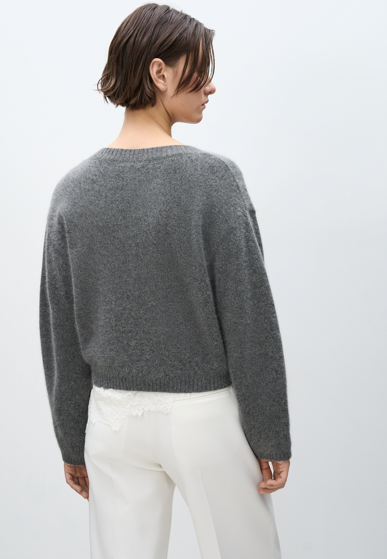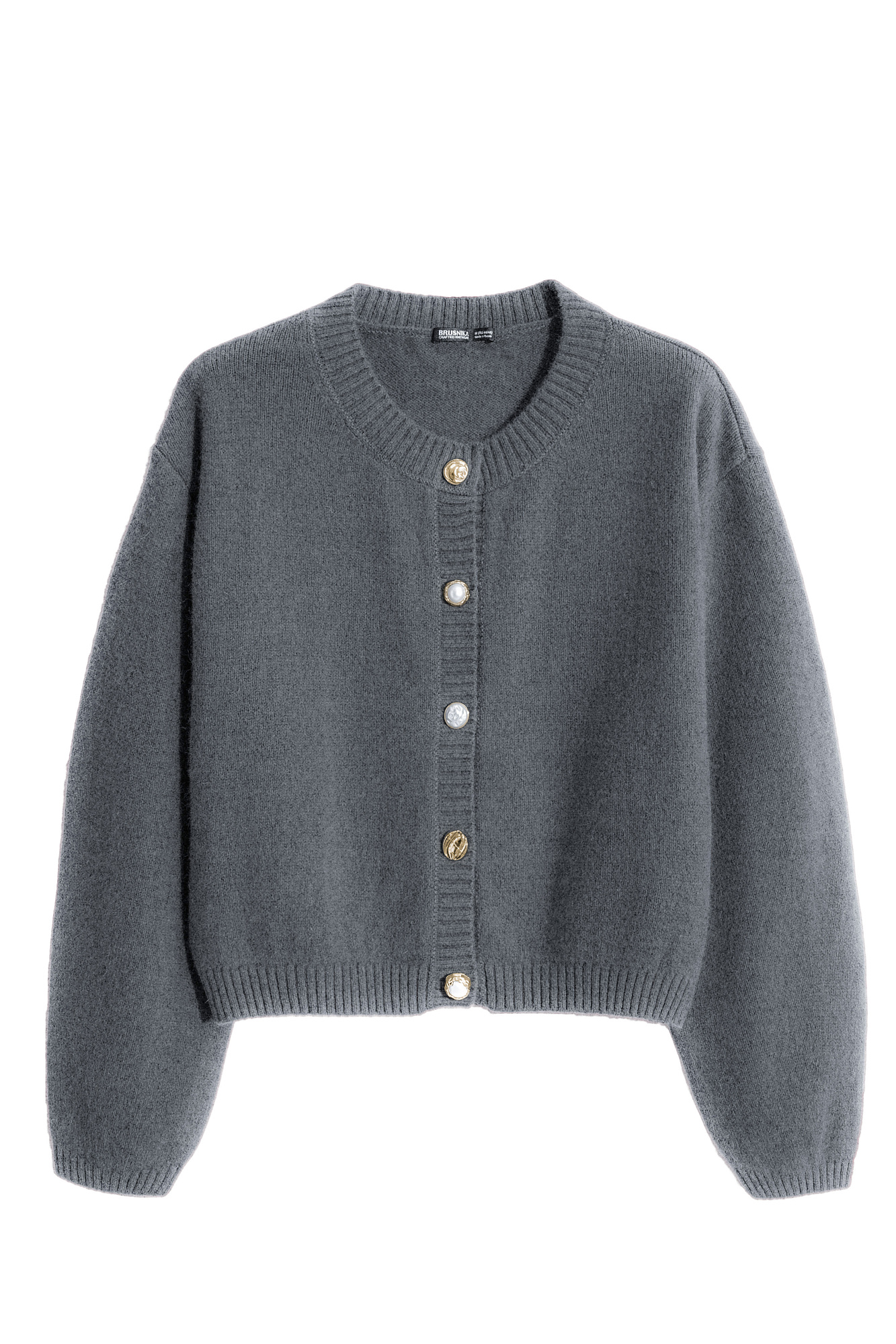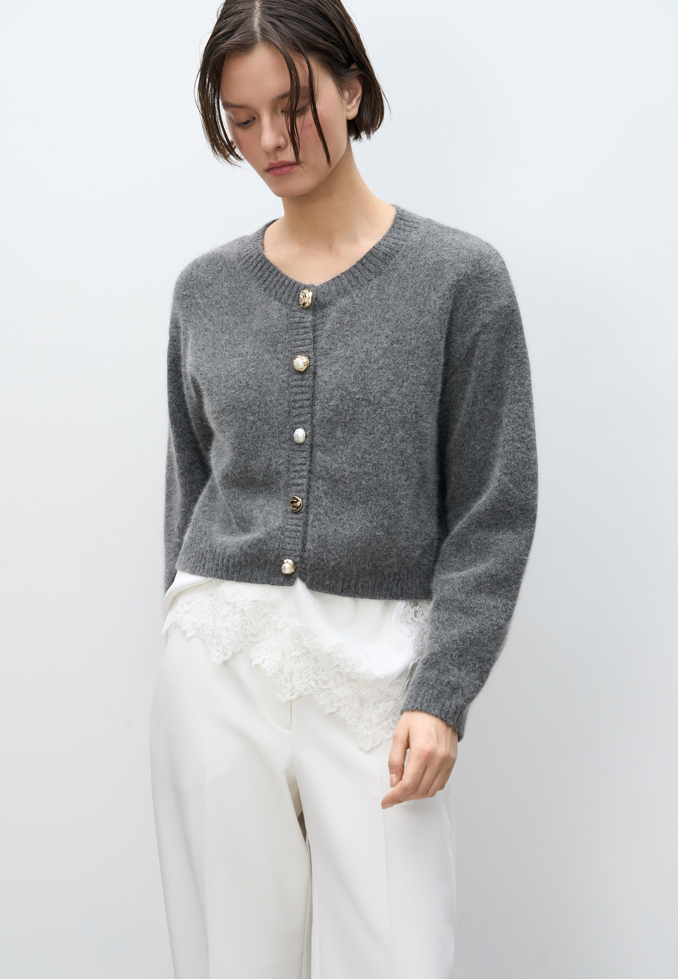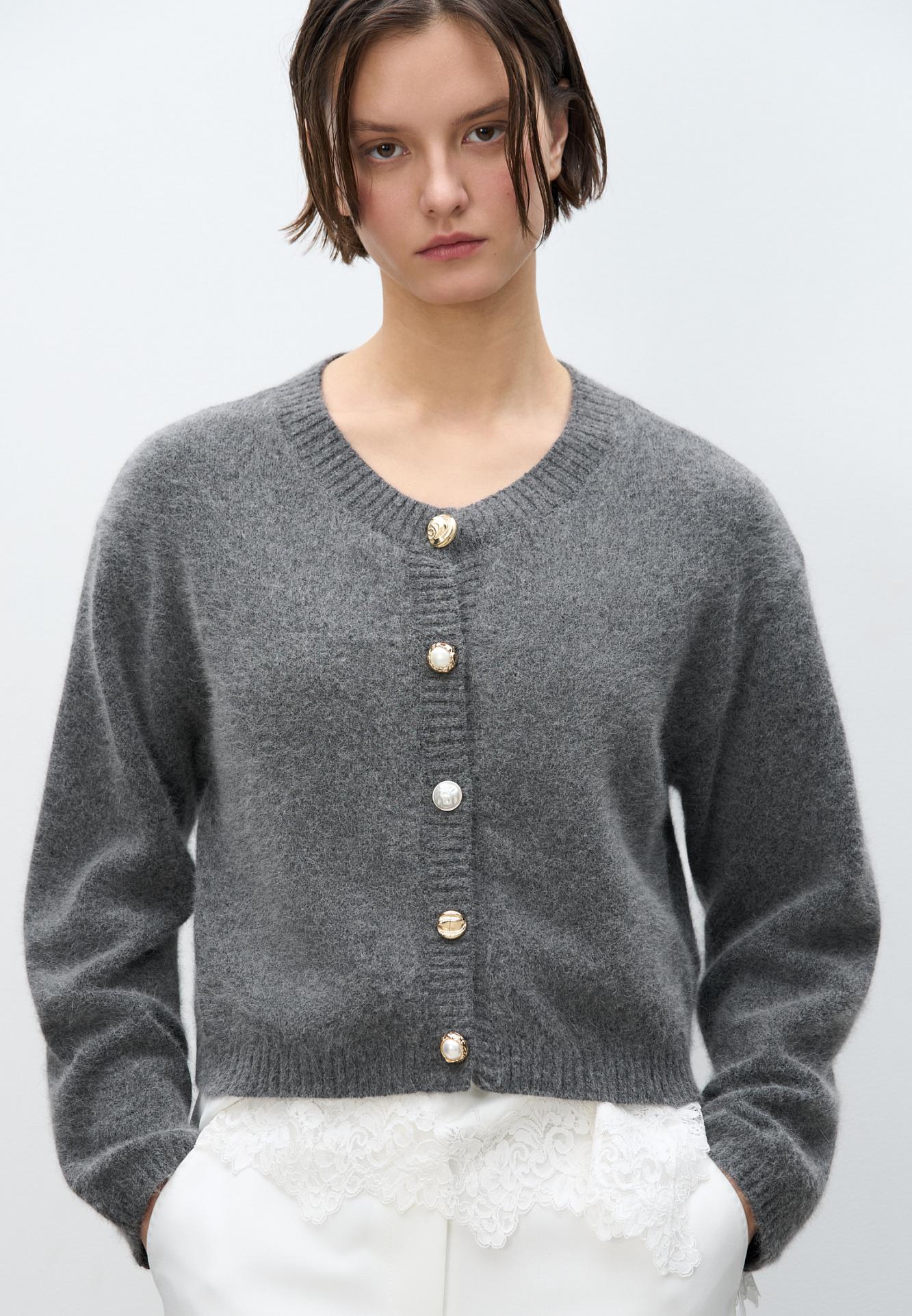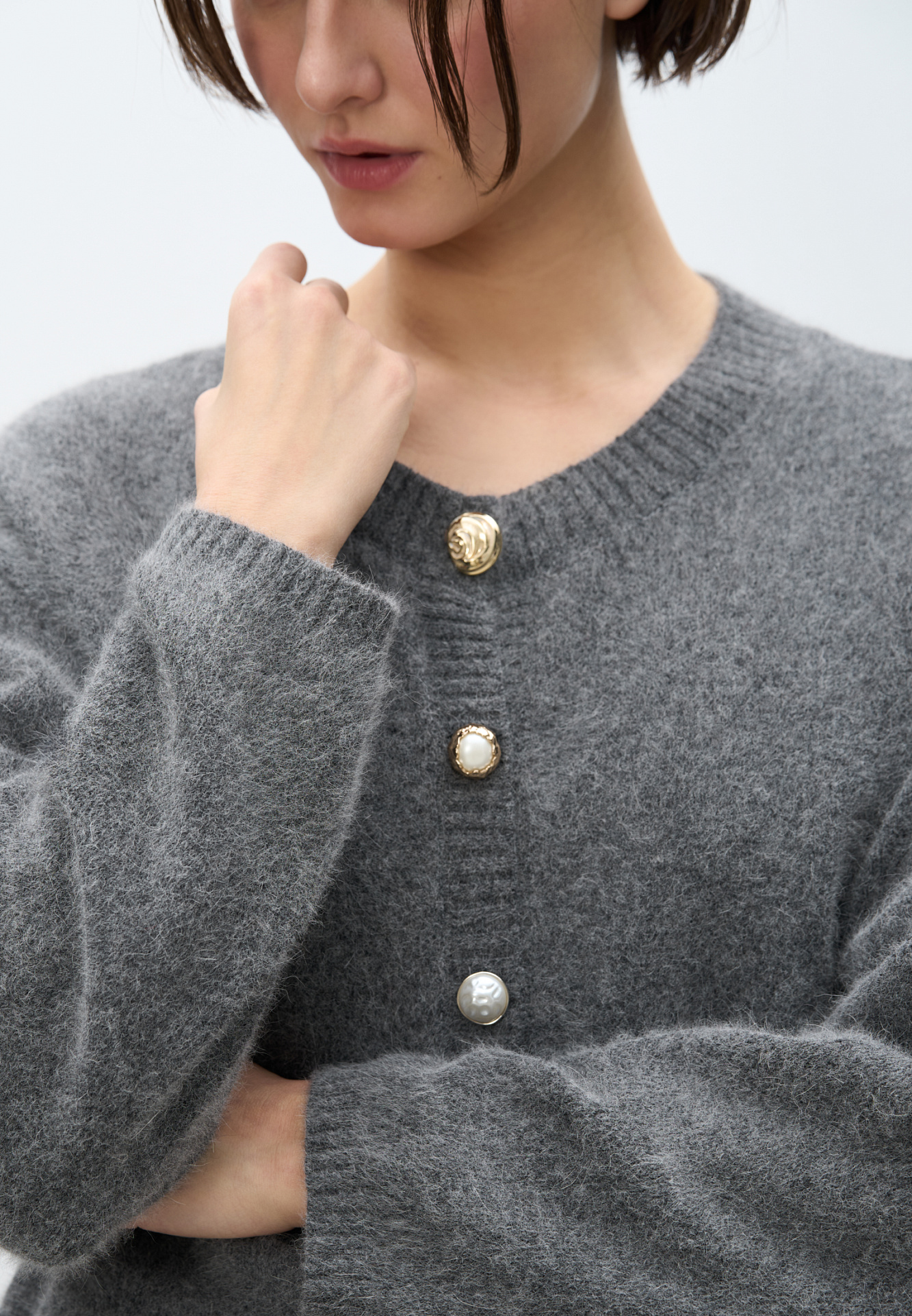 Трикотажный кардиган из пуха лисы. Модель свободного силуэта со спущенной линией плеч и круглым вырезом горловины. Изделие декорировано крупными акцентными пуговицами.