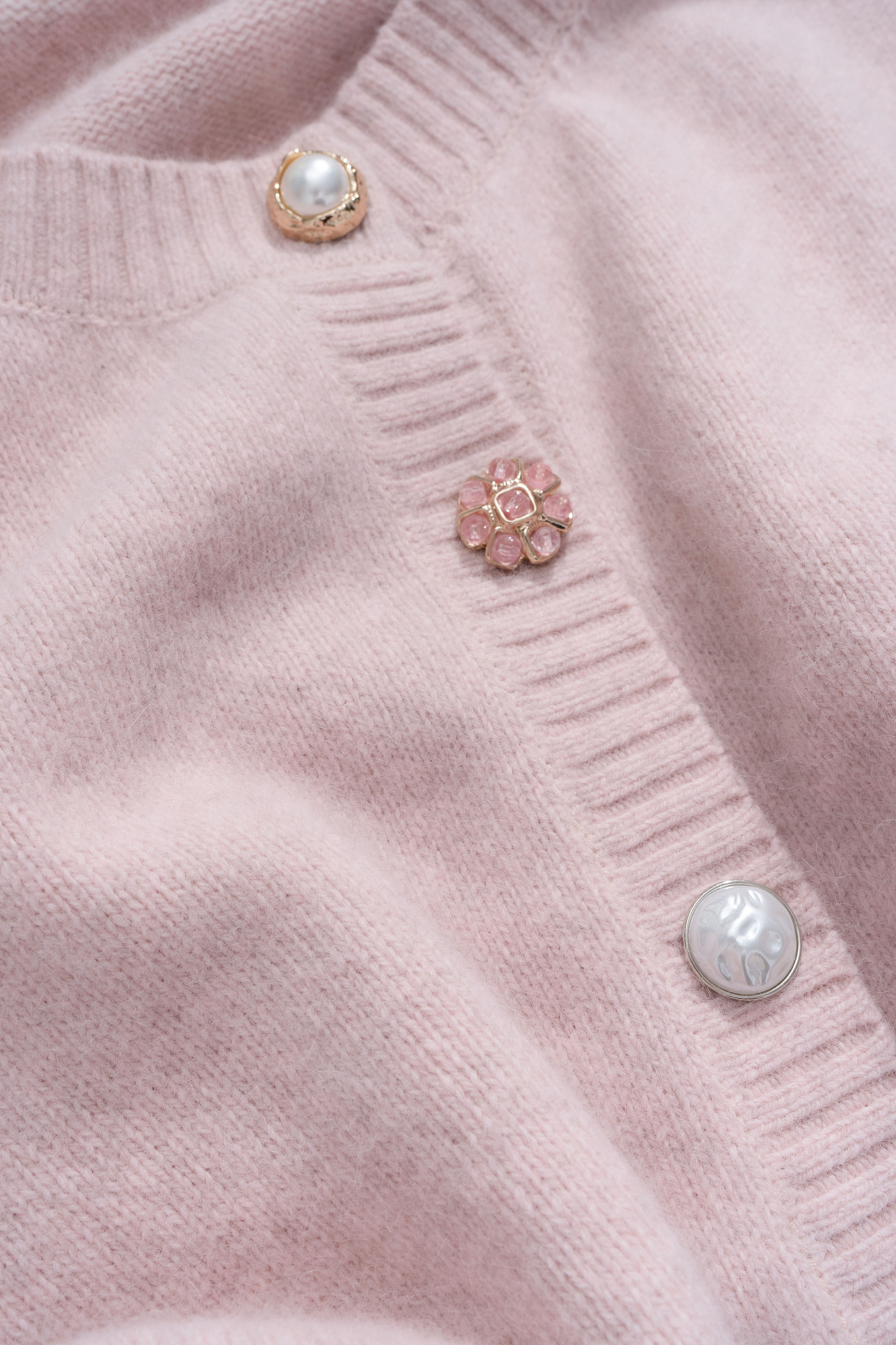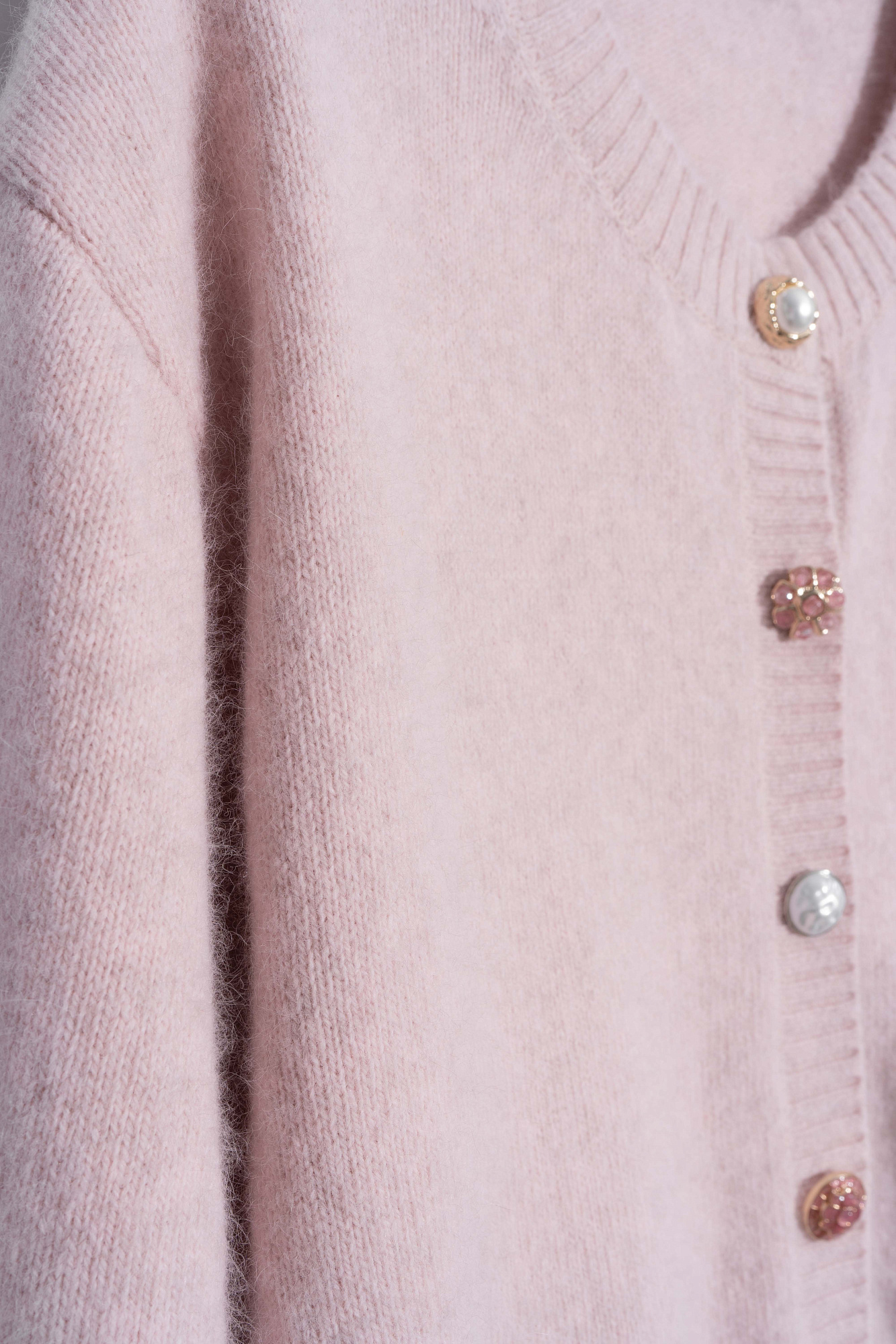 Трикотажный кардиган из пуха лисы. Модель свободного силуэта со спущенной линией плеч и круглым вырезом горловины. Изделие декорировано крупными акцентными пуговицами.