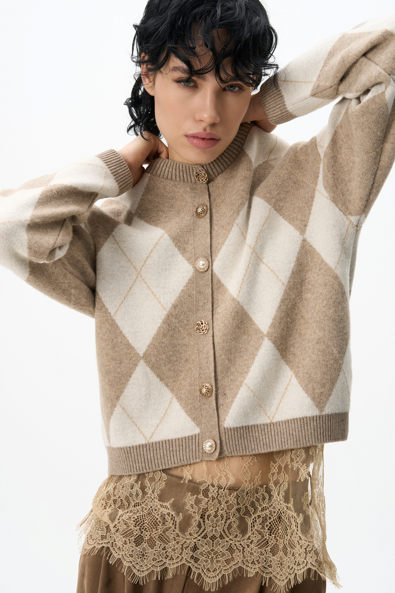 Трикотажный кардиган с узором аргайл из шерсти с добавлением кашемира. Модель свободного силуэта со спущенной линией плеч, круглым вырезом горловины и застежкой на крупные пуговицы. Края изделия выполнены в рубчик.