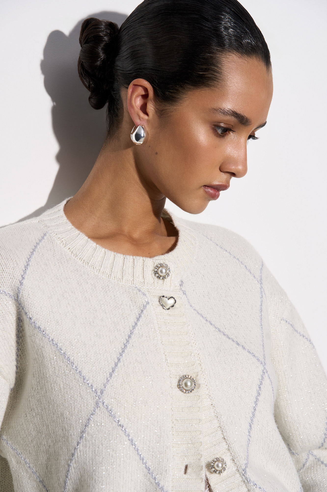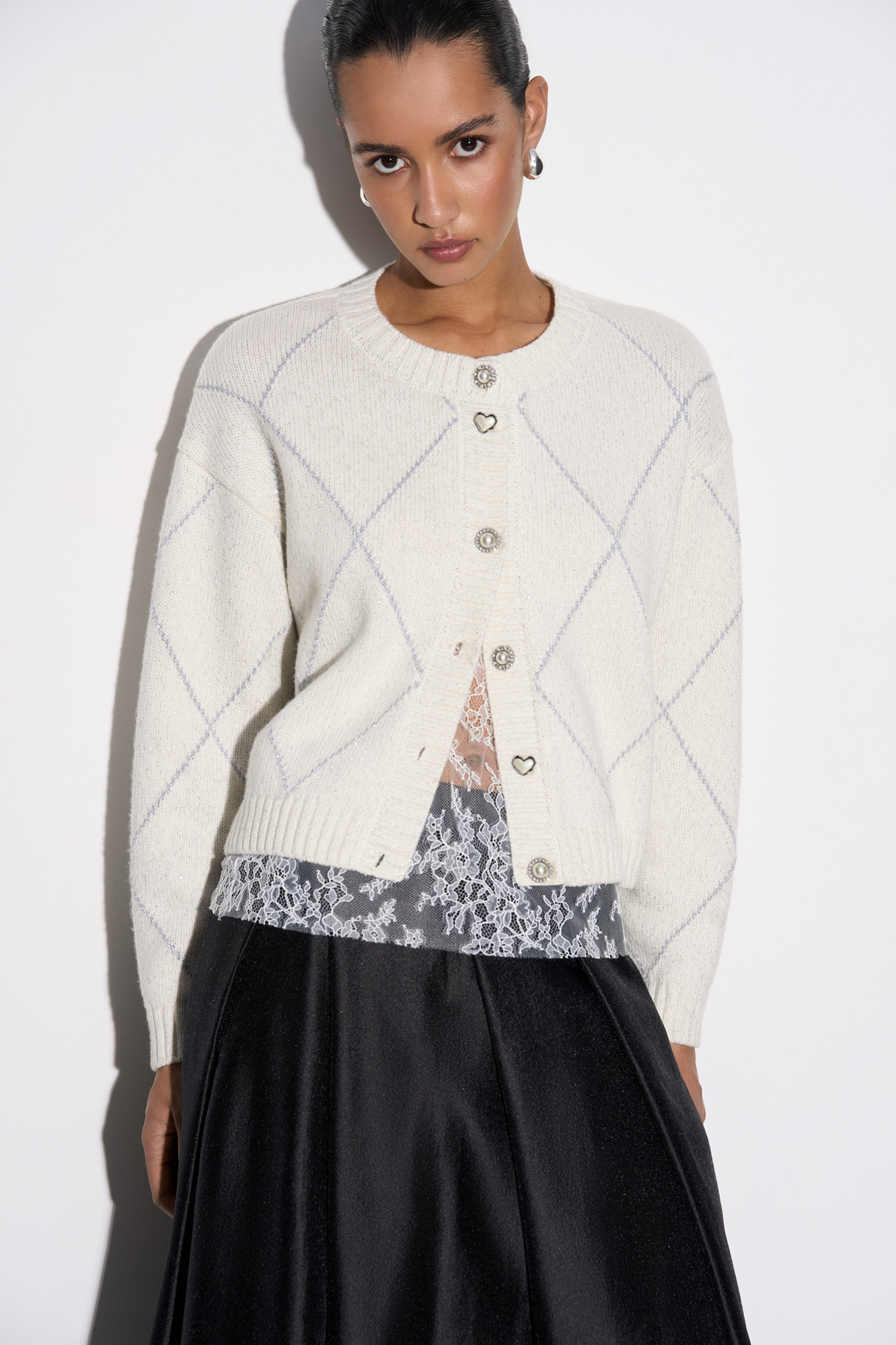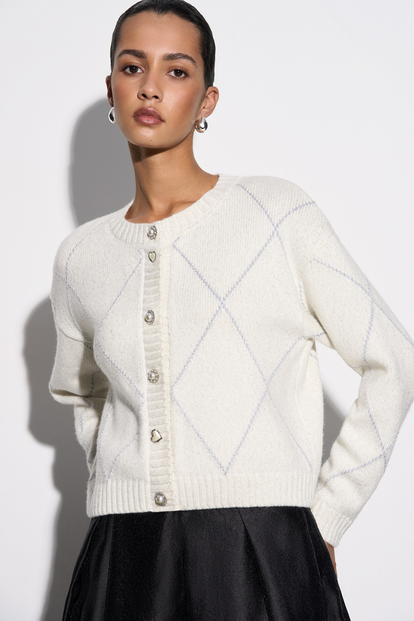 Трикотажный кардиган с узором аргайл из шерсти яка с добавлением люрекса. Модель свободного силуэта со спущенной линией плеч, круглым вырезом горловины и застежкой на крупные пуговицы. Края изделия выполнены в рубчик.