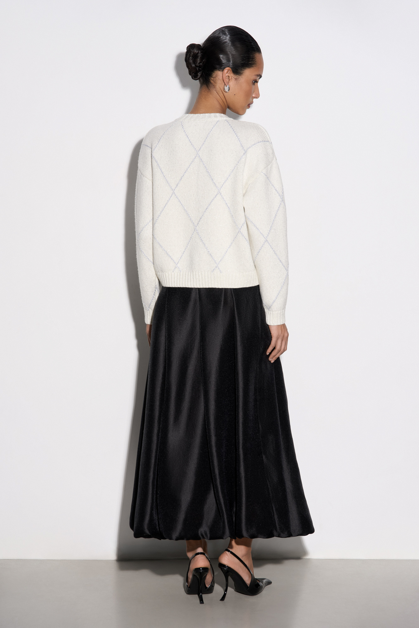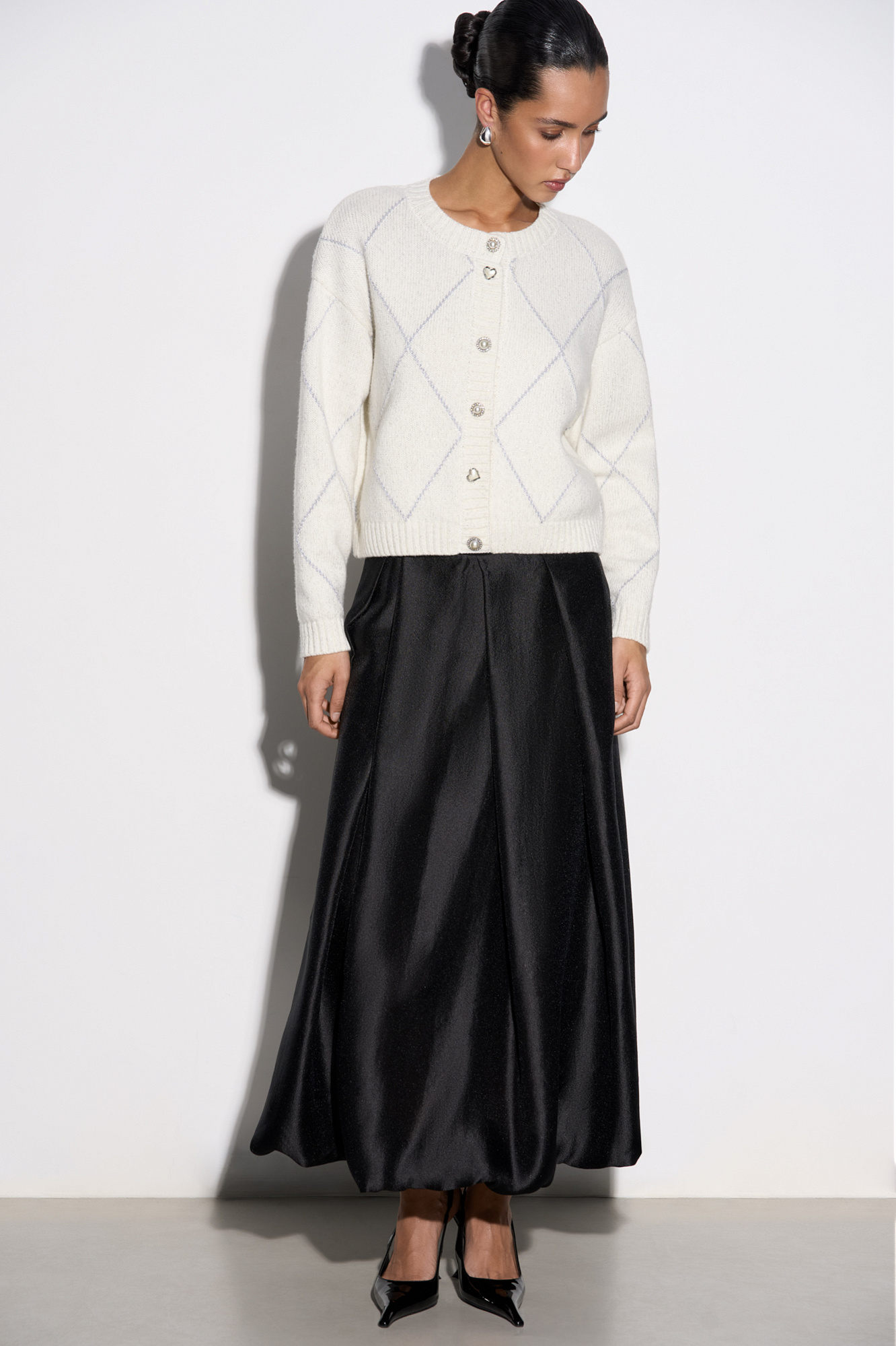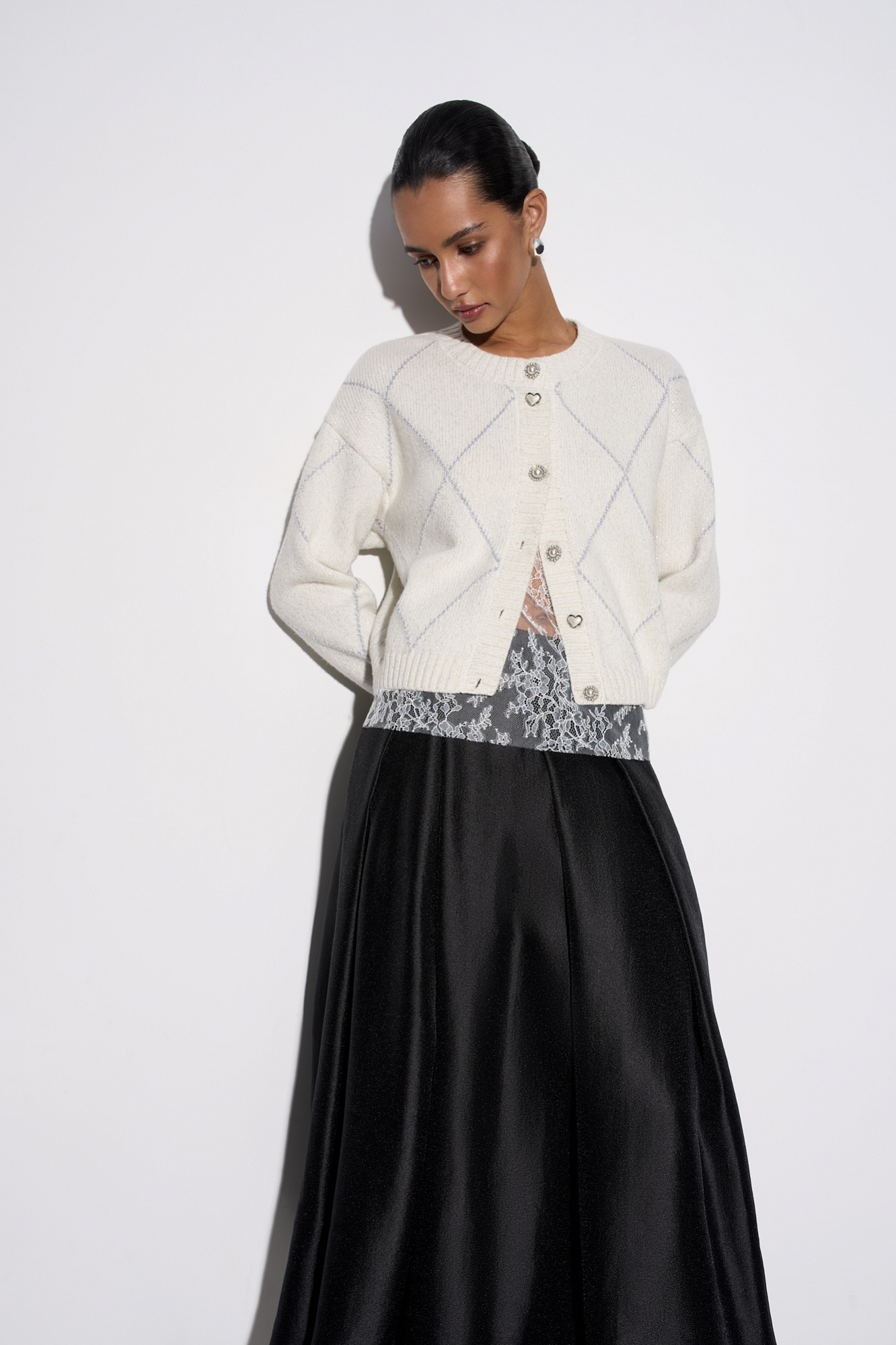 Трикотажный кардиган с узором аргайл из шерсти яка с добавлением люрекса. Модель свободного силуэта со спущенной линией плеч, круглым вырезом горловины и застежкой на крупные пуговицы. Края изделия выполнены в рубчик.