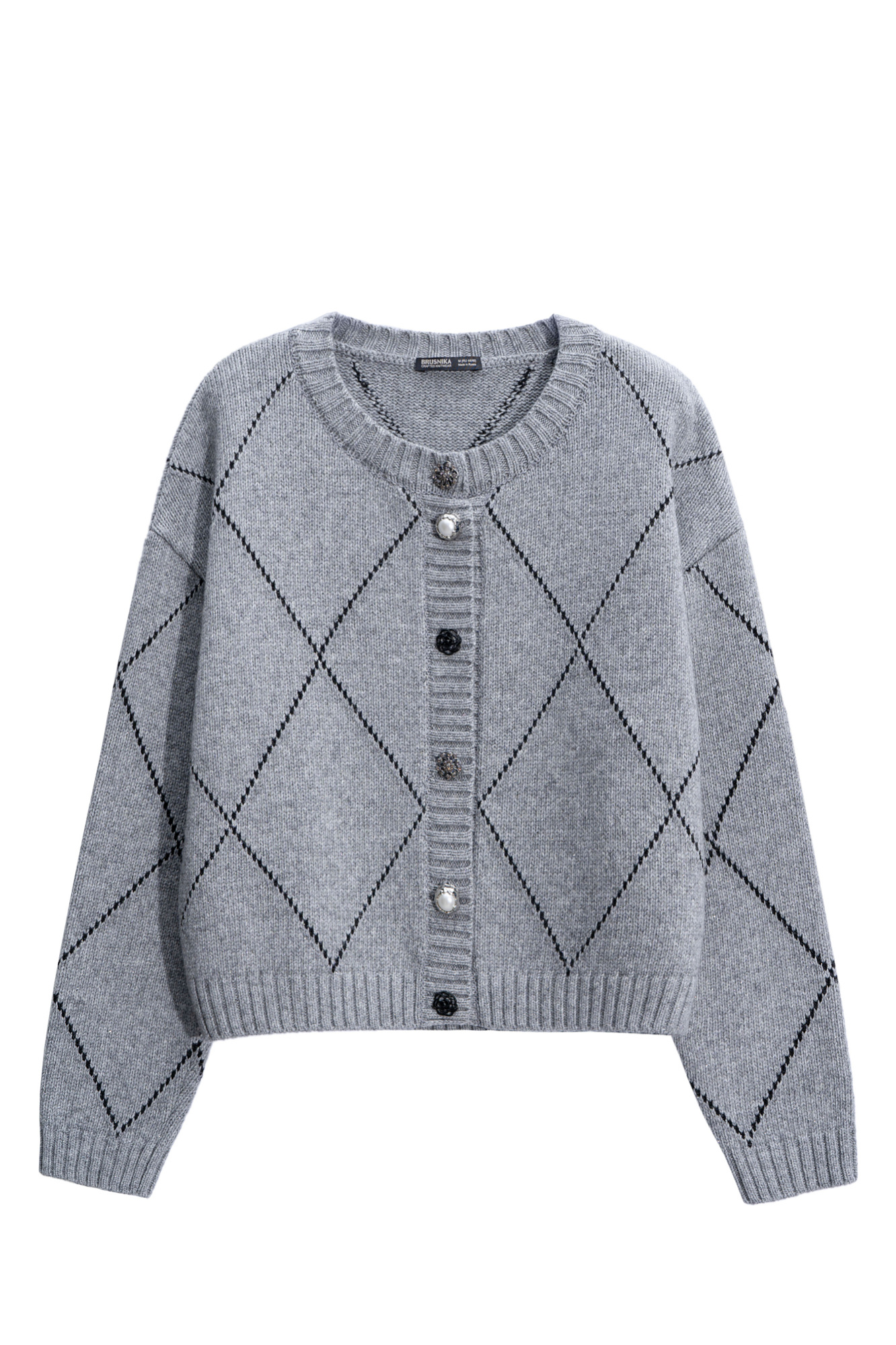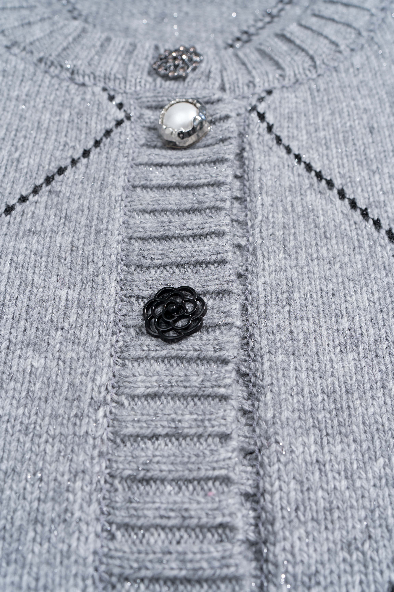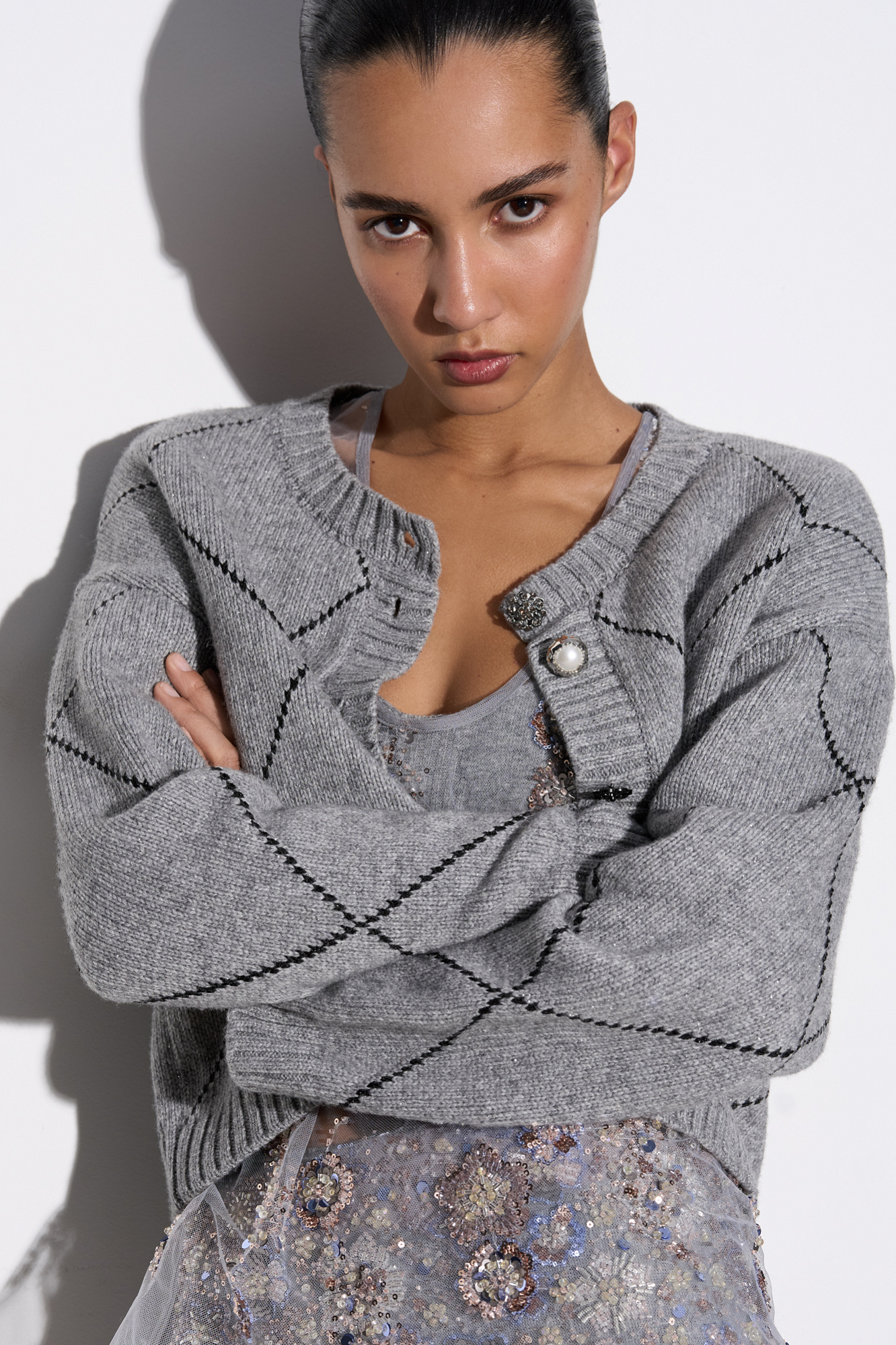 Трикотажный кардиган с узором аргайл из шерсти яка с добавлением люрекса. Модель свободного силуэта со спущенной линией плеч, круглым вырезом горловины и застежкой на крупные пуговицы. Края изделия выполнены в рубчик.