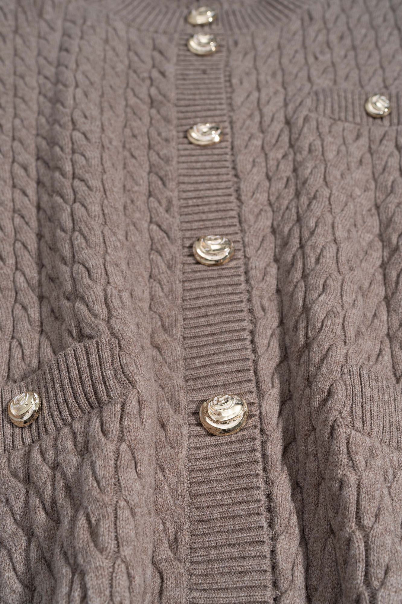 Кардиган из 100% шерстимериноса экстрафайн, выполненный вязкой косами. Модель свободного кроя с длинными рукавами, спущенной линией плеч и круглым вырезом горловины. Имитация карманов с клапанами. Изделие декорировано крупными акцентными пуговицами.