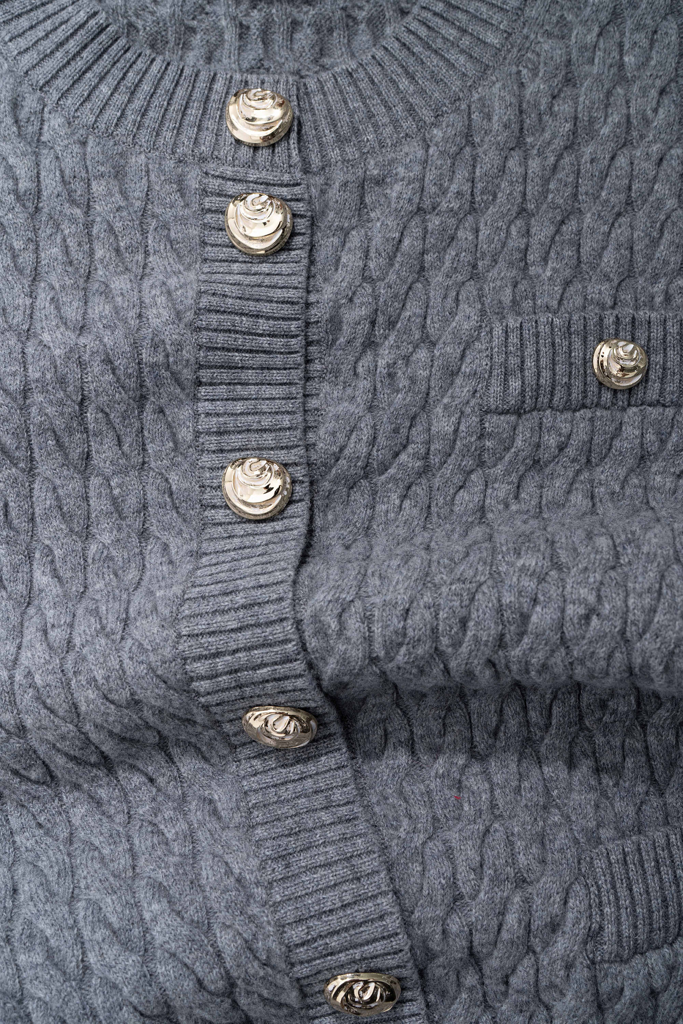 Кардиган из 100% шерсти мериноса экстрафайн, выполненный вязкой косами. Модель свободного кроя с длинными рукавами, спущенной линией плеч и круглым вырезом горловины. Имитация карманов с клапанами. Изделие декорировано крупными акцентными пуговицами.