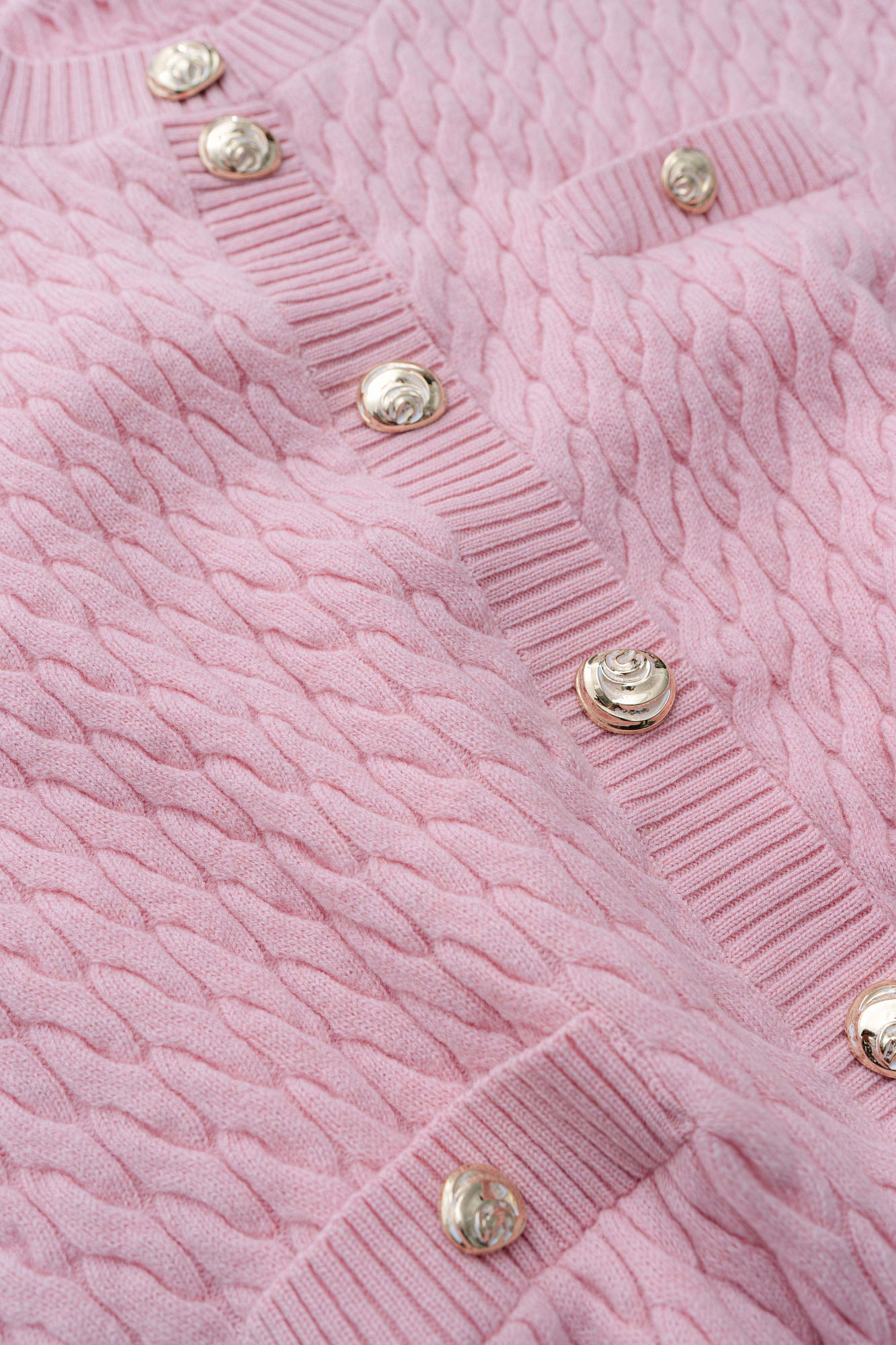Кардиган из 100% шерсти мериноса экстрафайн, выполненный вязкой косами. Модель свободного кроя с длинными рукавами, спущенной линией плеч и круглым вырезом горловины. Имитация карманов с клапанами. Изделие декорировано крупными акцентными пуговицами.