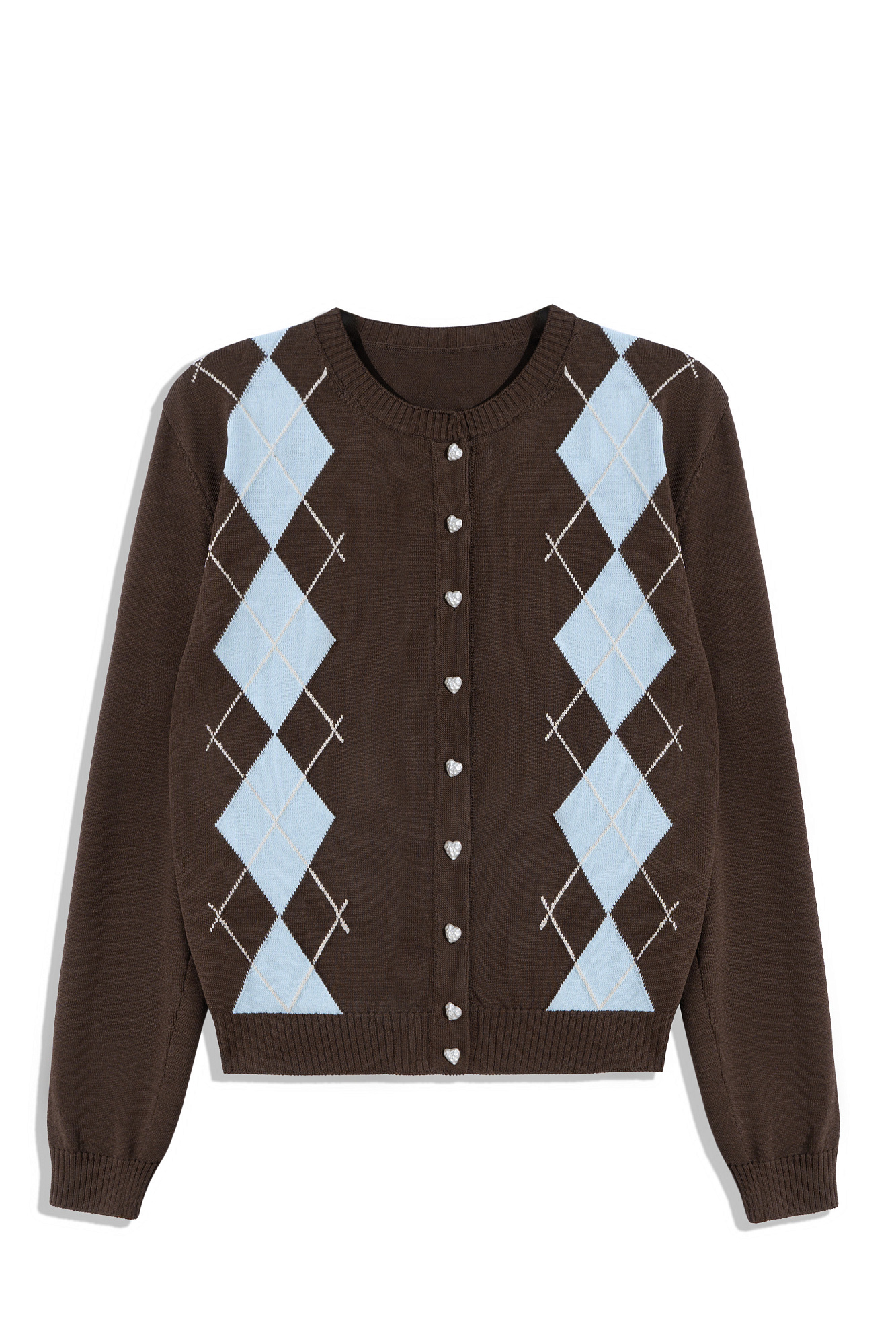 Трикотажный кардиган из вискозы с узором аргайл. Модель свободного силуэта с длинными рукавами, круглым вырезом горловины и застежкой на пуговицы-сердечки. Края изделия выполнены в рубчик.