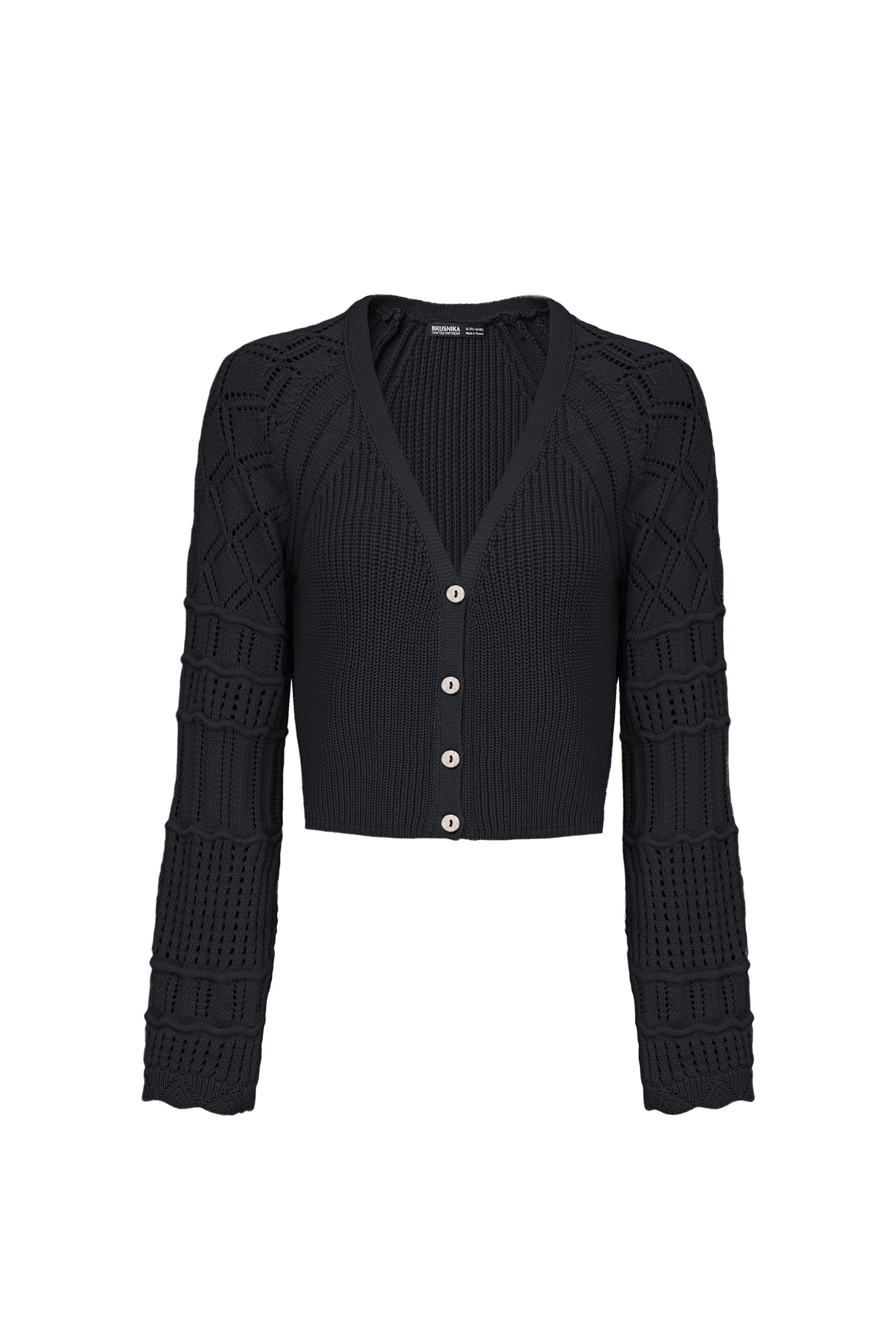 Трикотажный кардиган из хлопка с добавлением эластана. Модель укороченного кроя, с длинными вывязанными рукавами и застежкой на пуговицы.