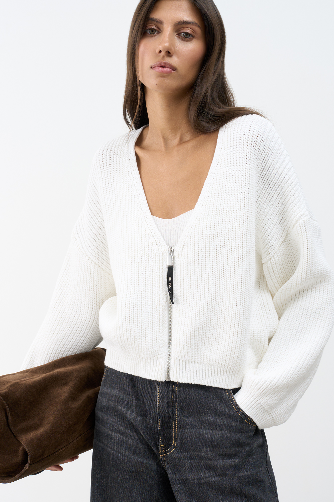 Трикотажный кардиган из 100% хлопка. Модель укороченного силуэта, со спущенной линией плеч, V-вырезом и застежкой на молнию.