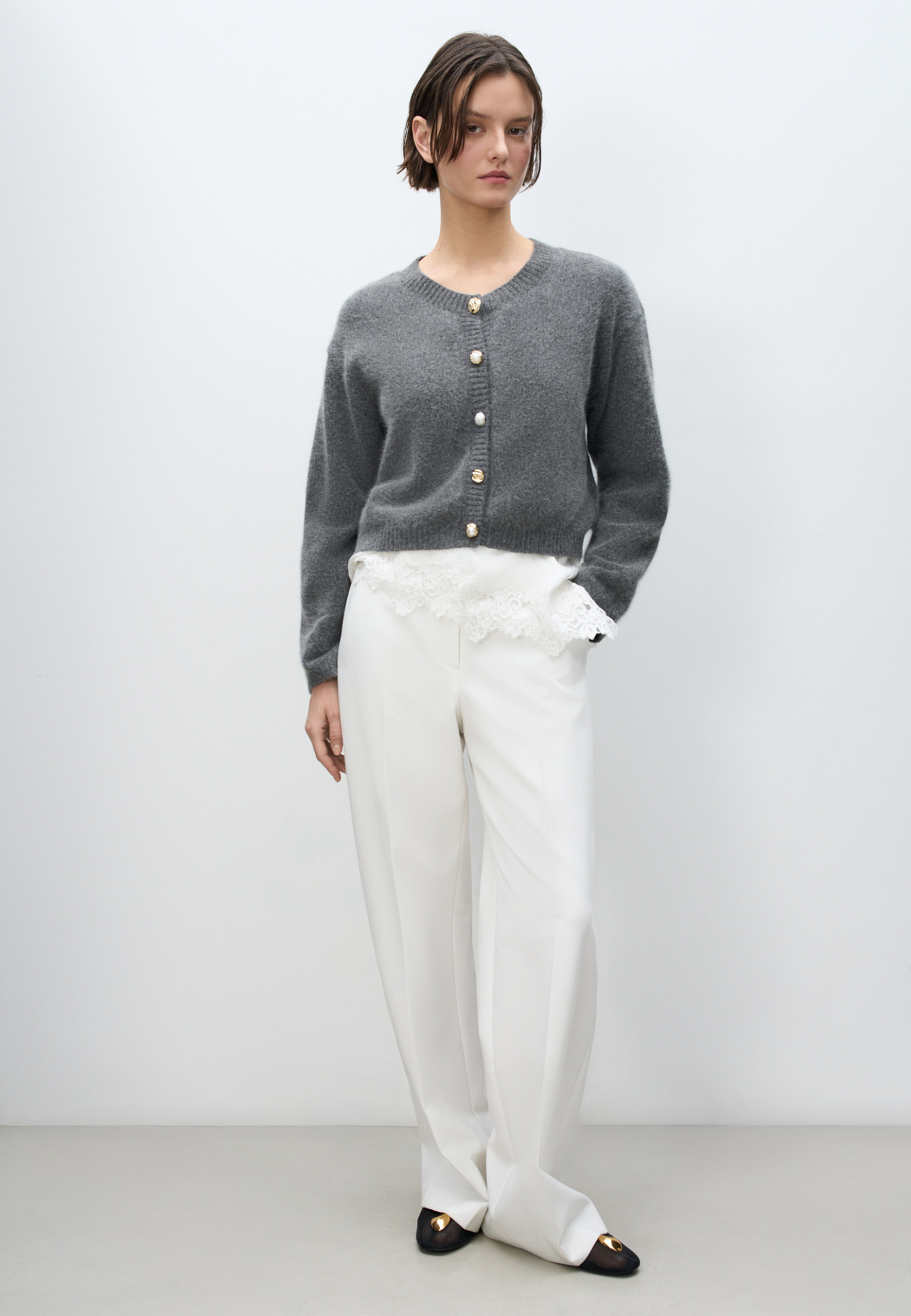 Трикотажный кардиган из пуха лисы. Модель свободного силуэта со спущенной линией плеч и круглым вырезом горловины. Изделие декорировано крупными акцентными пуговицами.