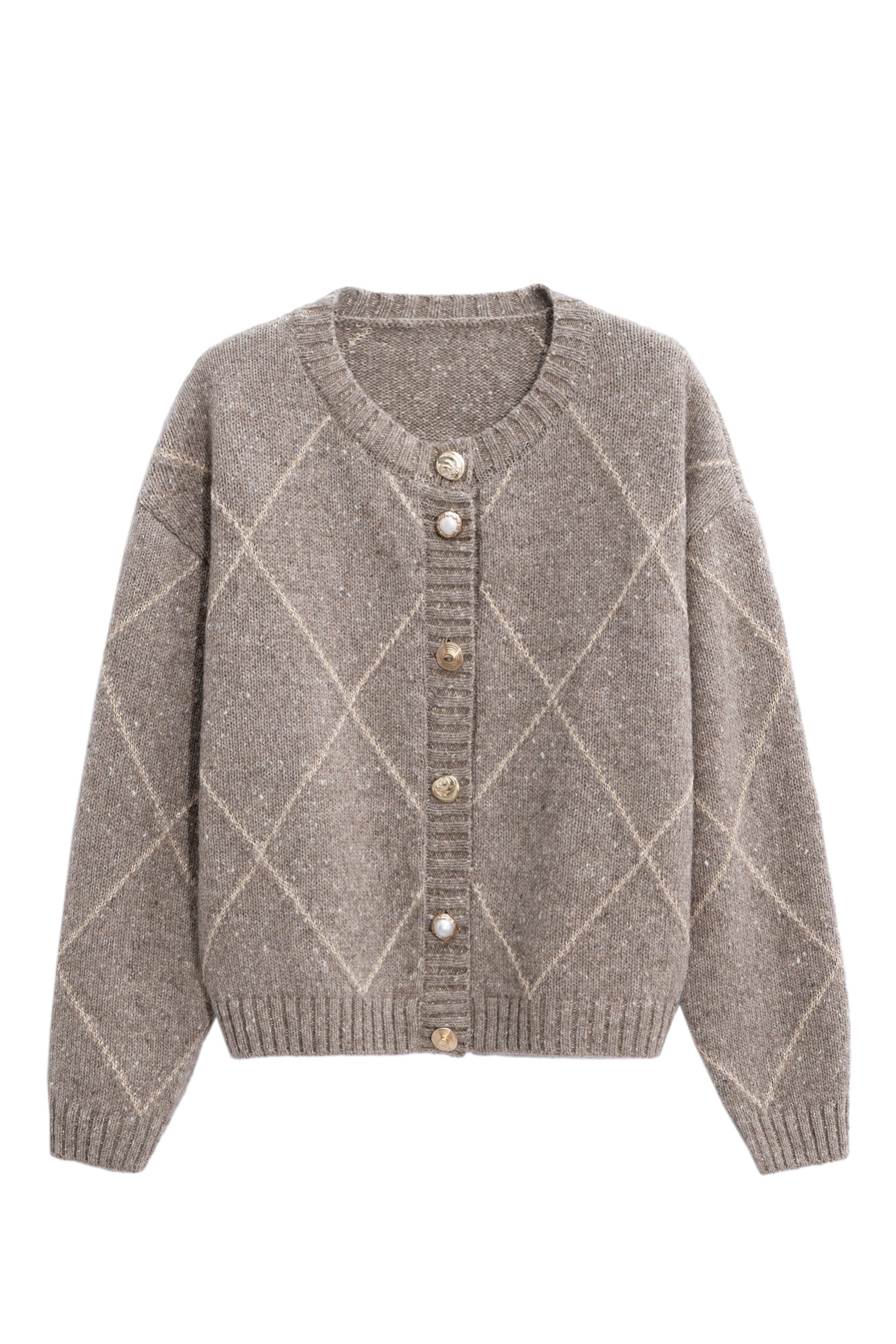 Трикотажный кардиган с узором аргайл из шерсти яка с добавлением люрекса. Модель свободного силуэта со спущенной линией плеч, круглым вырезом горловины и застежкой на крупные пуговицы. Края изделия выполнены в рубчик.