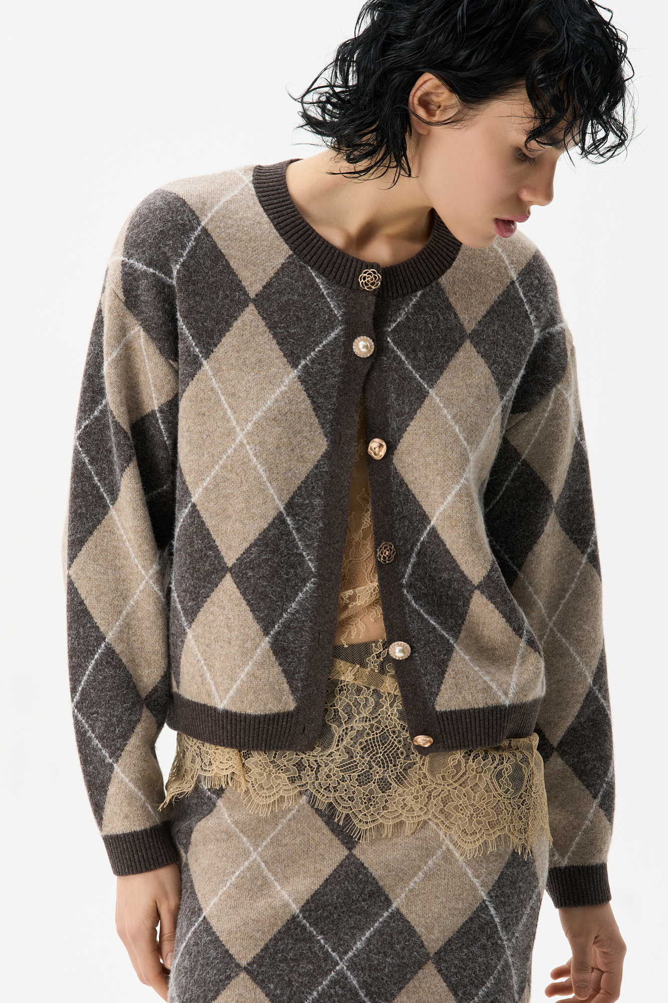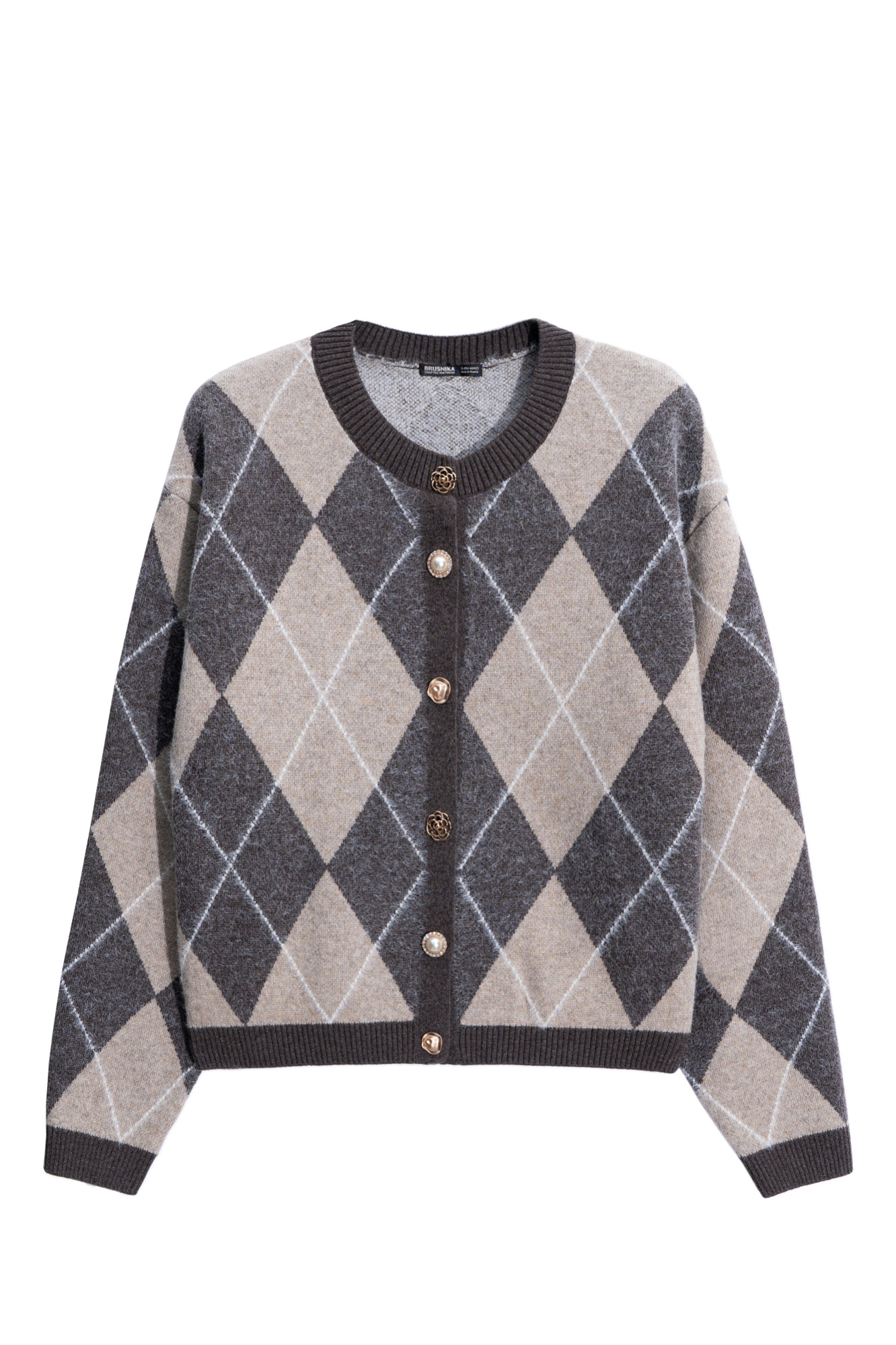 Трикотажный кардиган с узором аргайл из шерсти с добавлением кашемира. Модель свободного силуэта со спущенной линией плеч, круглым вырезом горловины и застежкой на крупные пуговицы. Края изделия выполнены в рубчик.