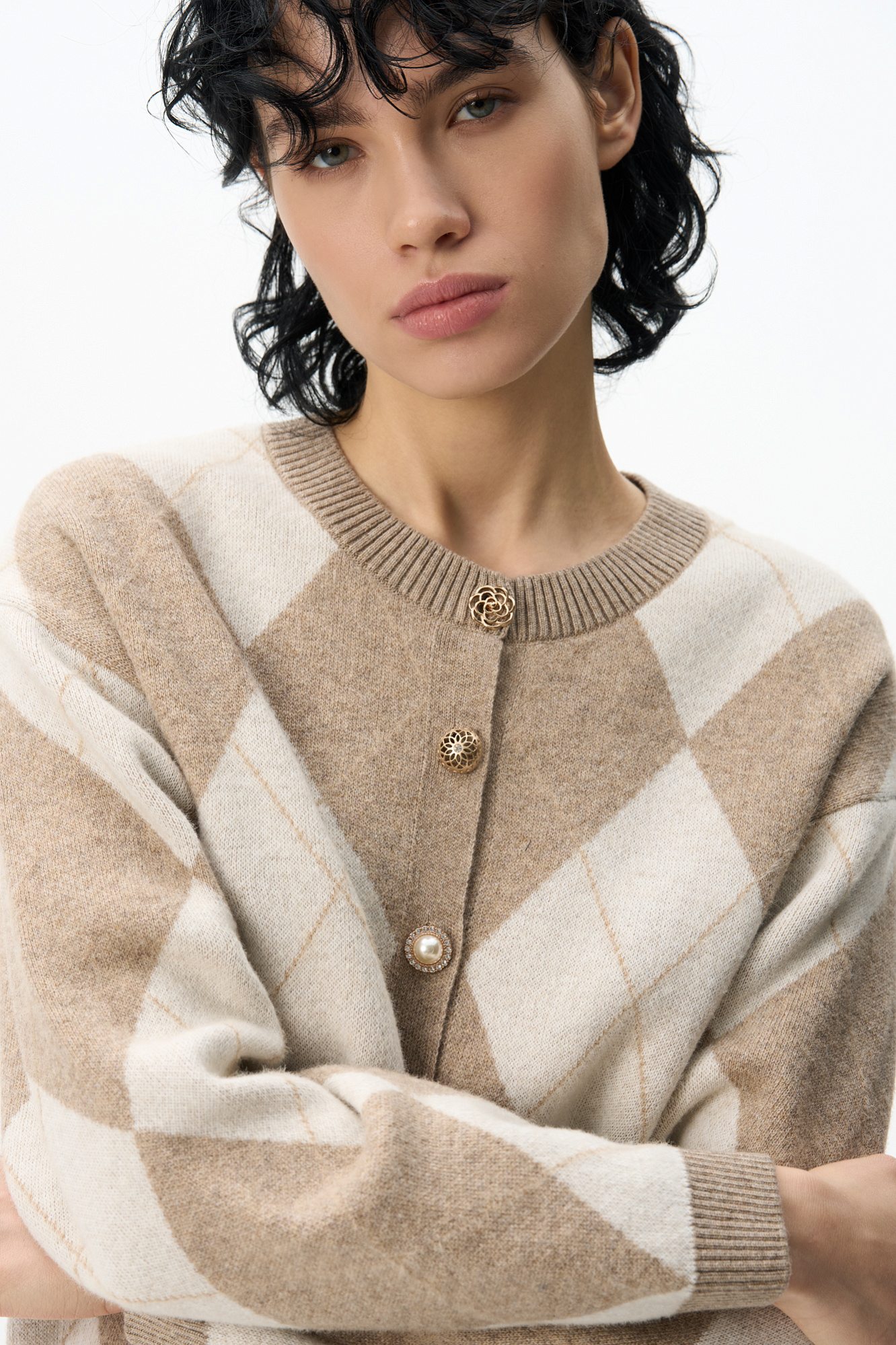 Трикотажный кардиган с узором аргайл из шерсти с добавлением кашемира. Модель свободного силуэта со спущенной линией плеч, круглым вырезом горловины и застежкой на крупные пуговицы. Края изделия выполнены в рубчик.