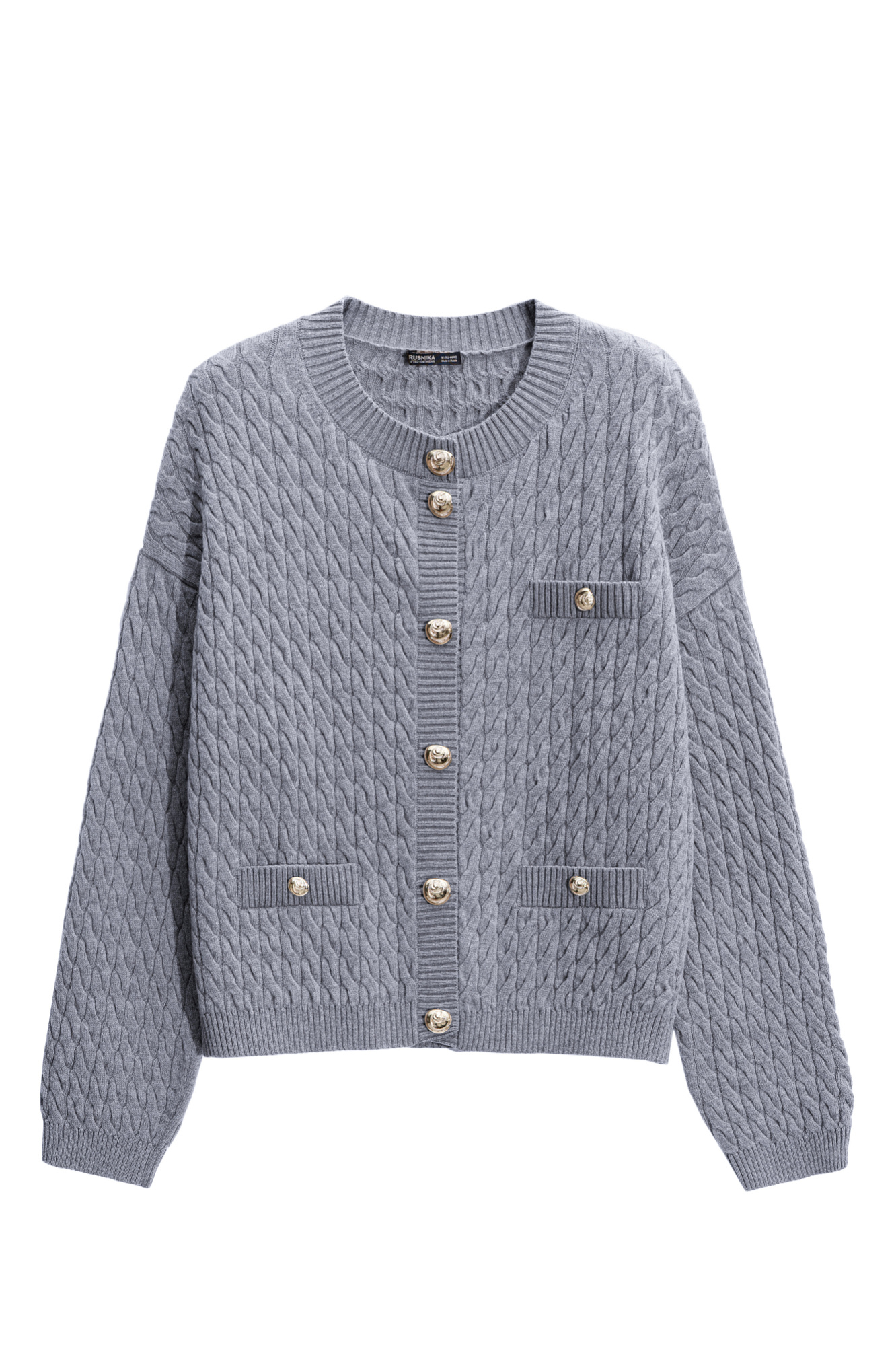 Кардиган из 100% шерсти мериноса экстрафайн, выполненный вязкой косами. Модель свободного кроя с длинными рукавами, спущенной линией плеч и круглым вырезом горловины. Имитация карманов с клапанами. Изделие декорировано крупными акцентными пуговицами.
