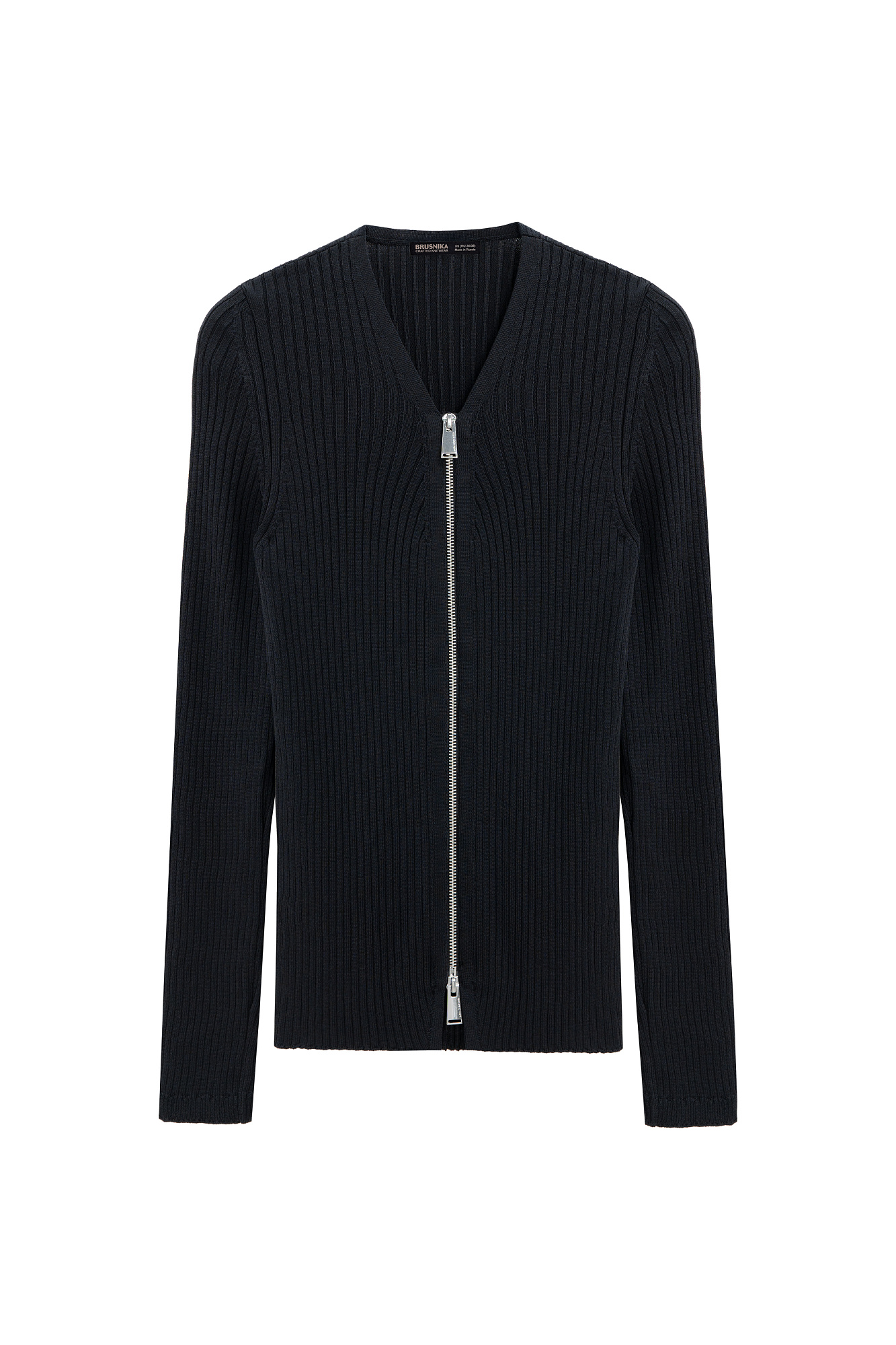 Трикотажный кардиган на молнии из вискозы. Модель прямого силуэта, с длинными рукавами и V-образным вырезом. Изделие выполнено в широкий рубчик.