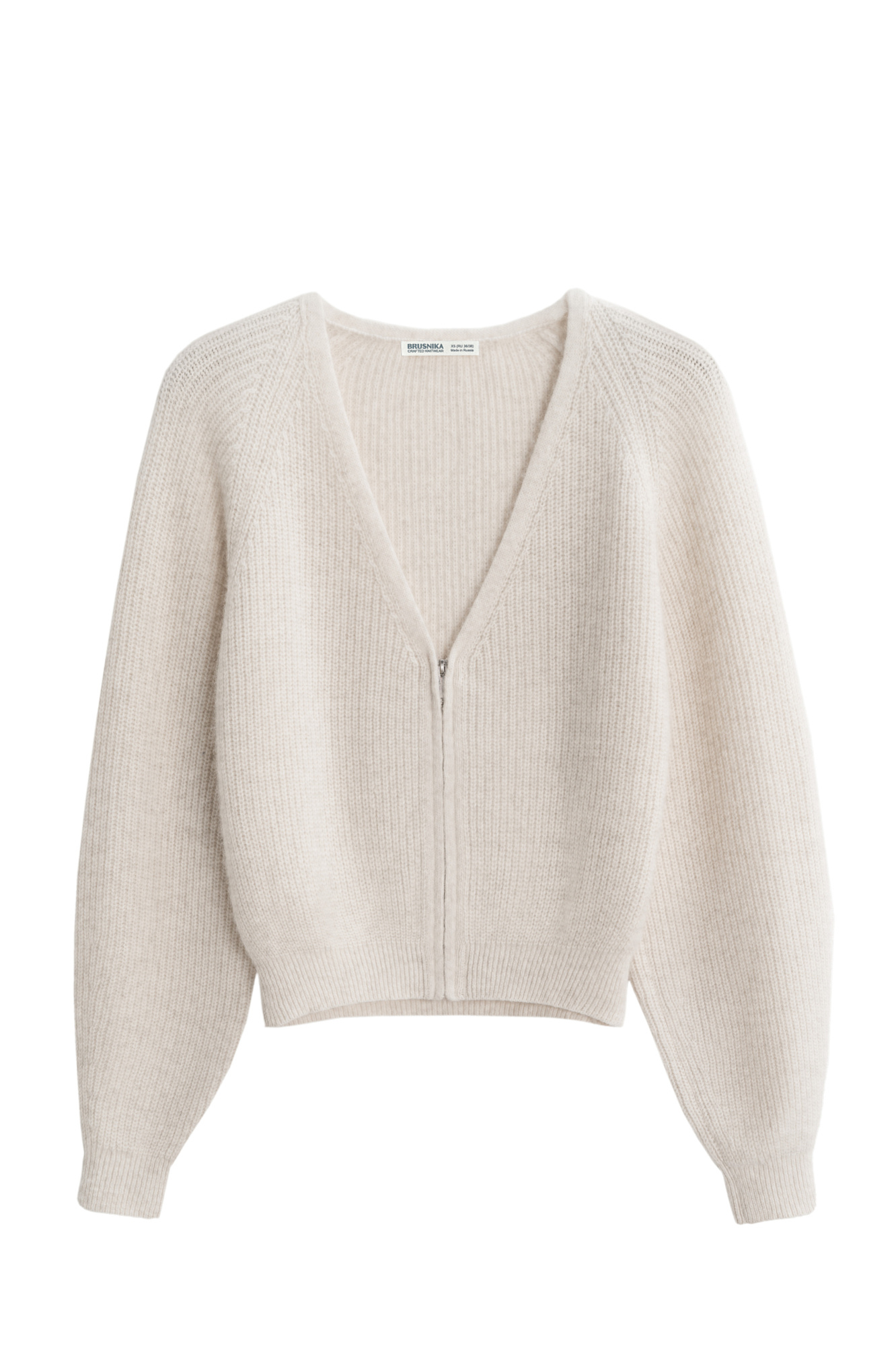 Укороченный кардиган на молнии с V-образным вырезом. Содержание в пряже 40% натурального пуха лисы делает изделие теплым, мягким и в тоже время очень легким.