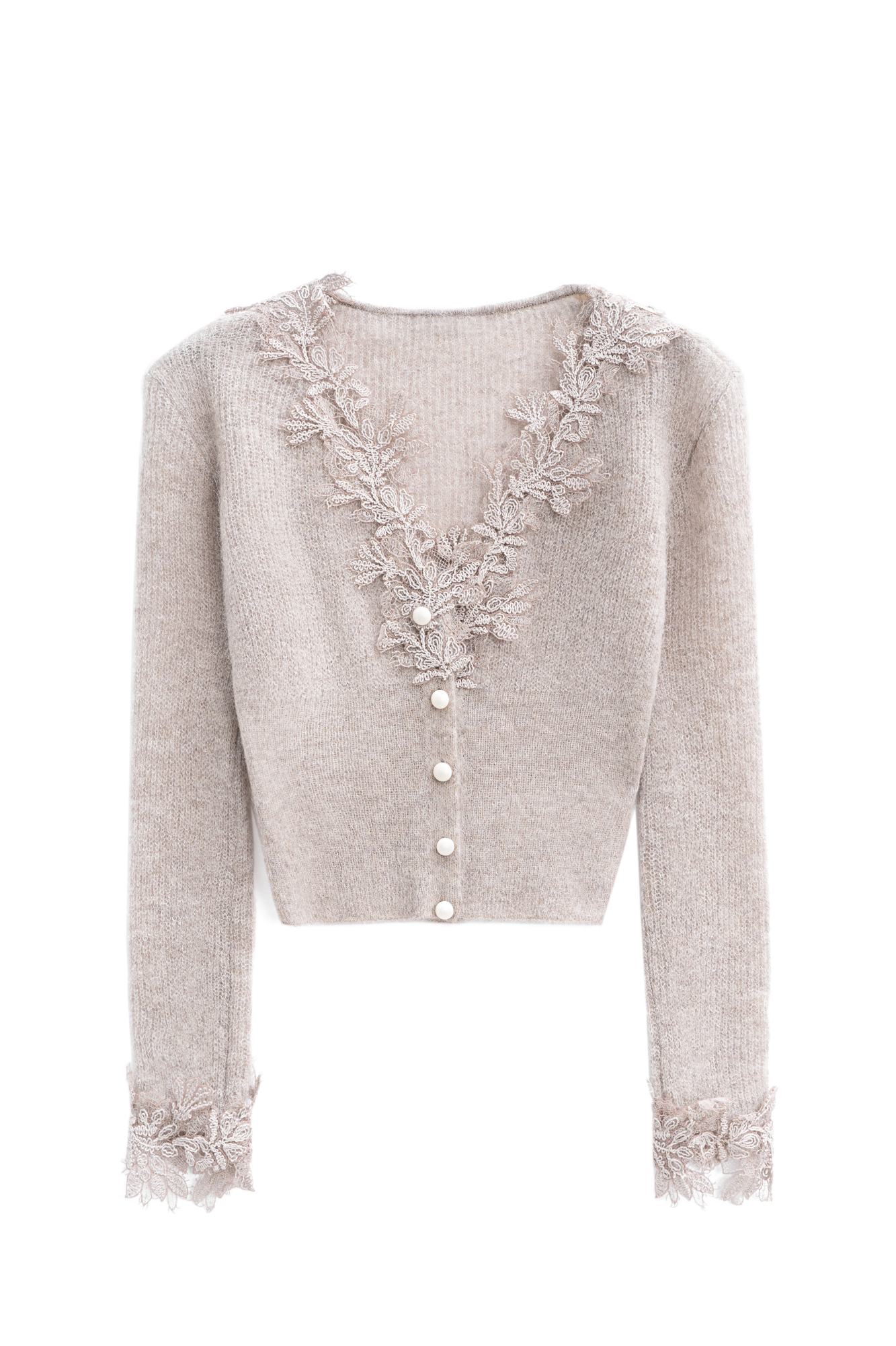 Короткий трикотажный кардиган из тонкой шерсти мериноса экстрафайн и альпака экстрафайн. Модель по фигуре с глубоким V-образным вырезом. Изделие декорировано тонким кружевом. Застежка на маленькие жемчужные пуговицы.