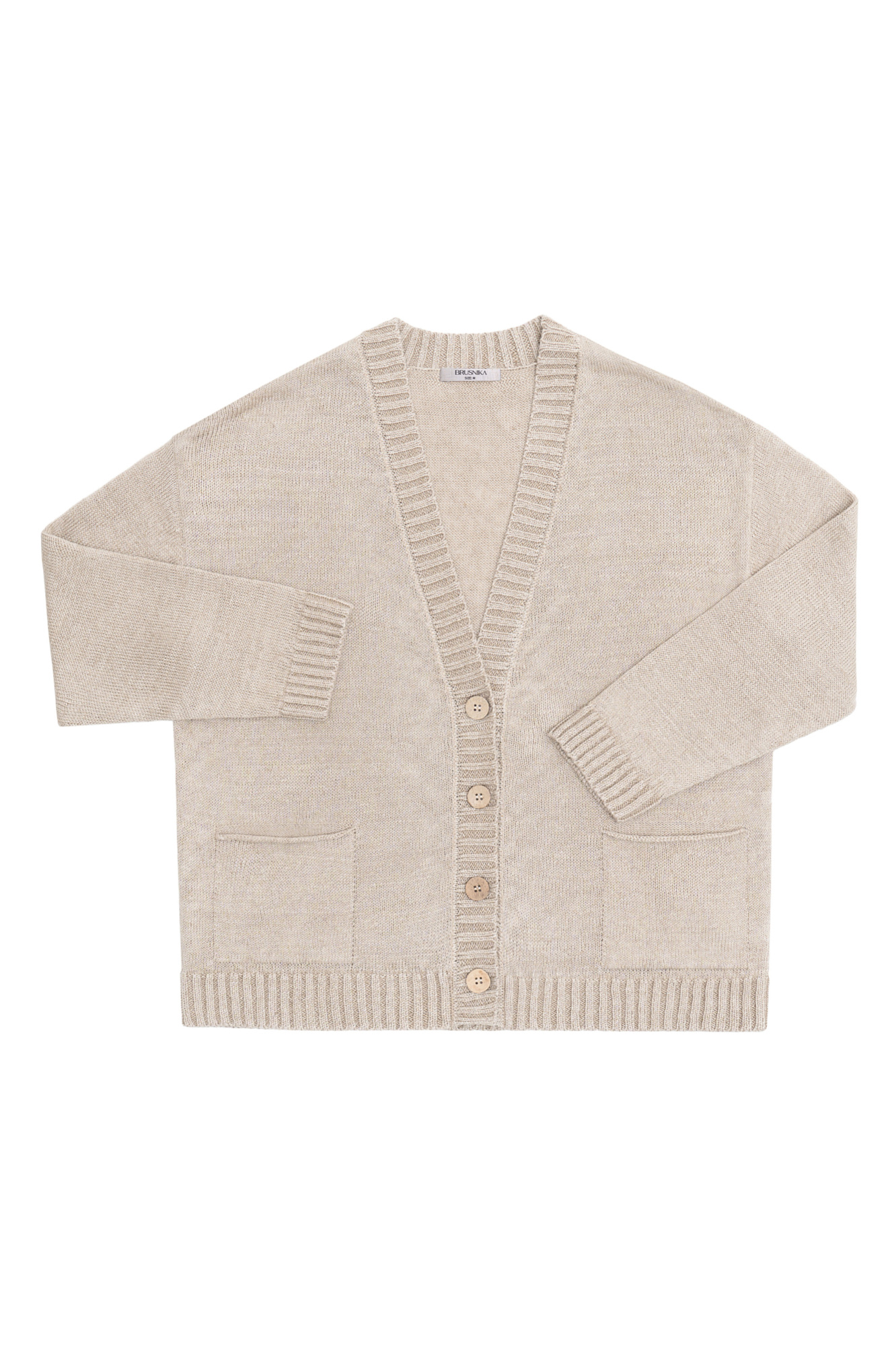Трикотажный кардиган из 100% льна. Модель свободного кроя со спущенной линией плеча, длинным рукавом, накладными карманами и V-образным вырезом горловины. Края изделия выполнены в рубчик. Застежка на пуговицы.