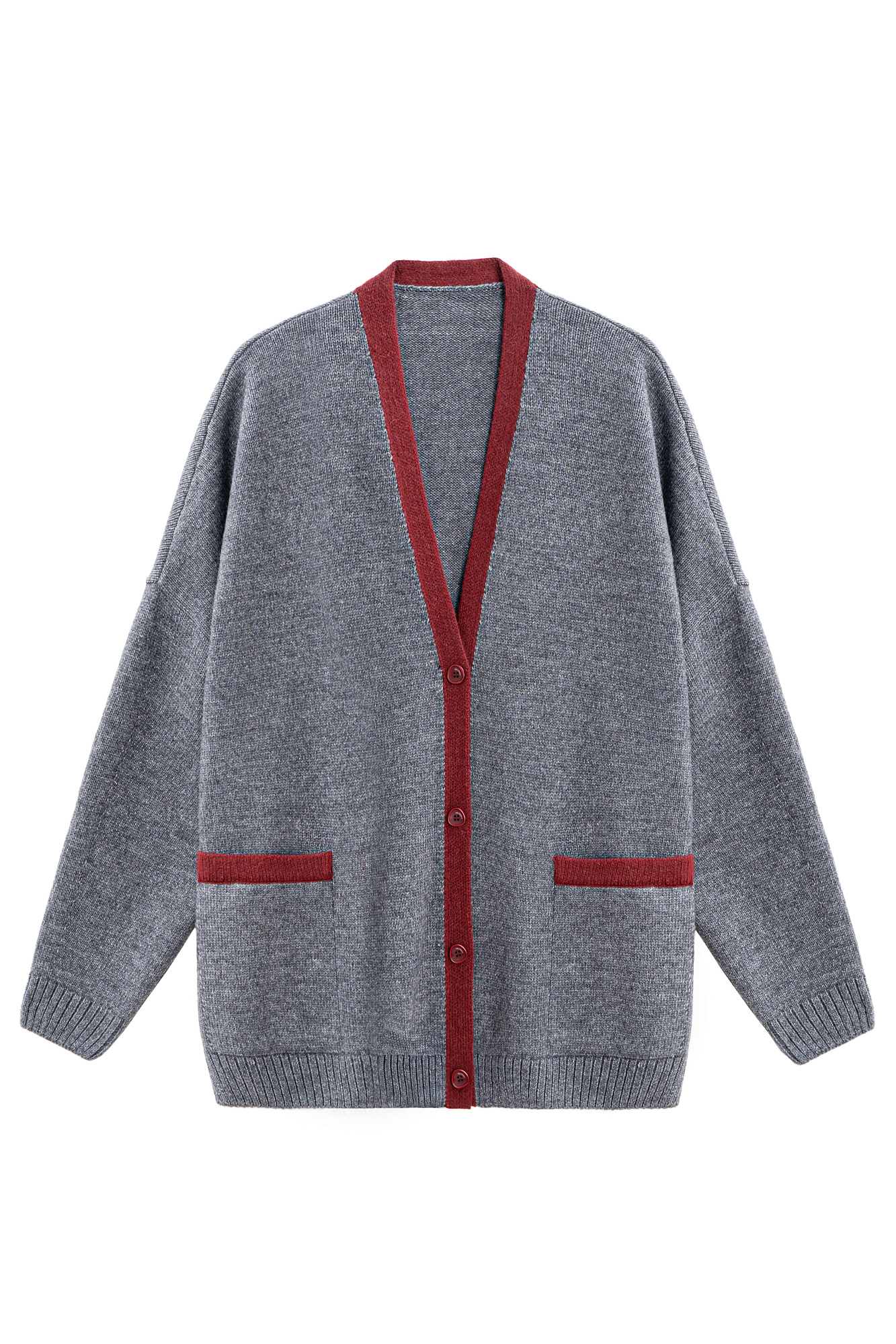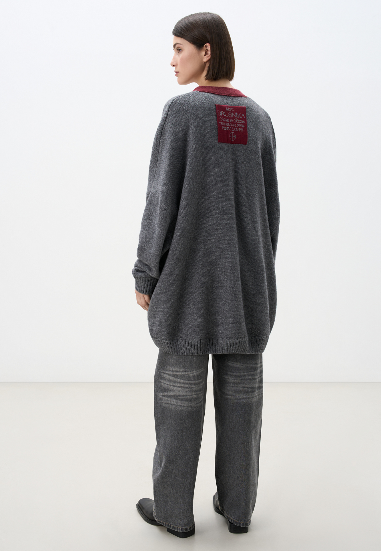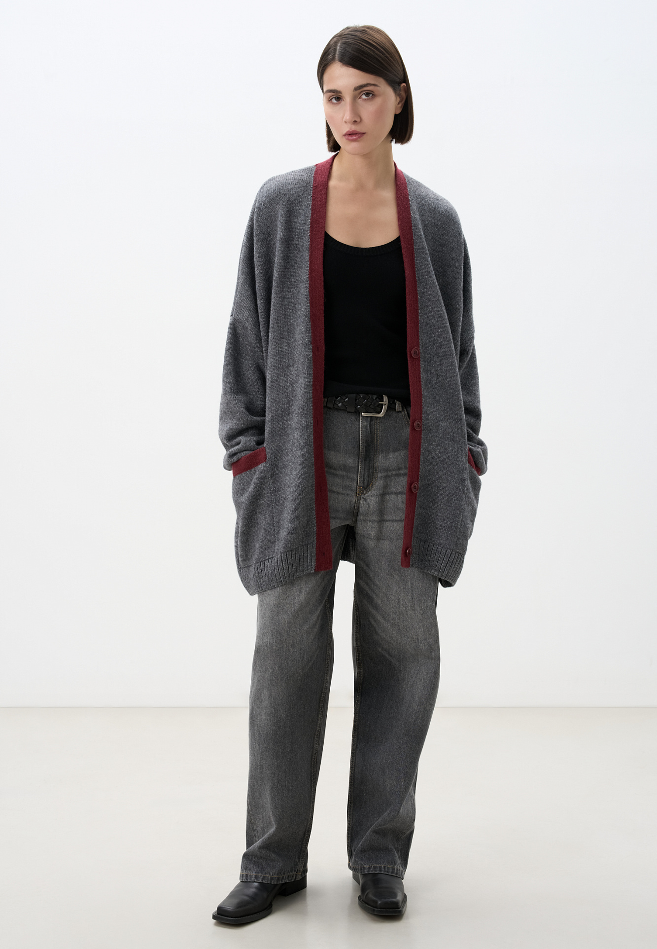 Трикотажный кардиган из шерсти альпака. Модель свободного силуэта, с длинными рукавами, спущенной линией плеч, V-образным вырезом, накладными карманами и застежкой на пуговицы. Изделие декорировано планкой и карманами контрастного цвета.