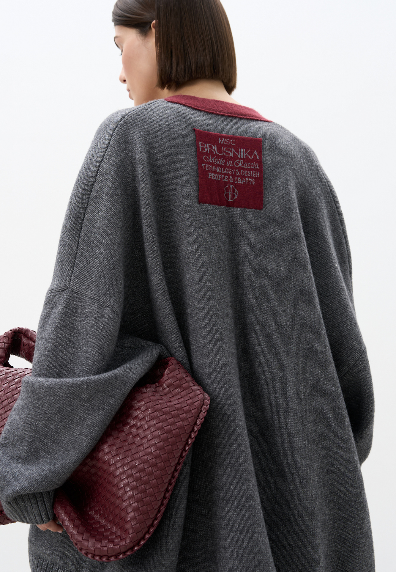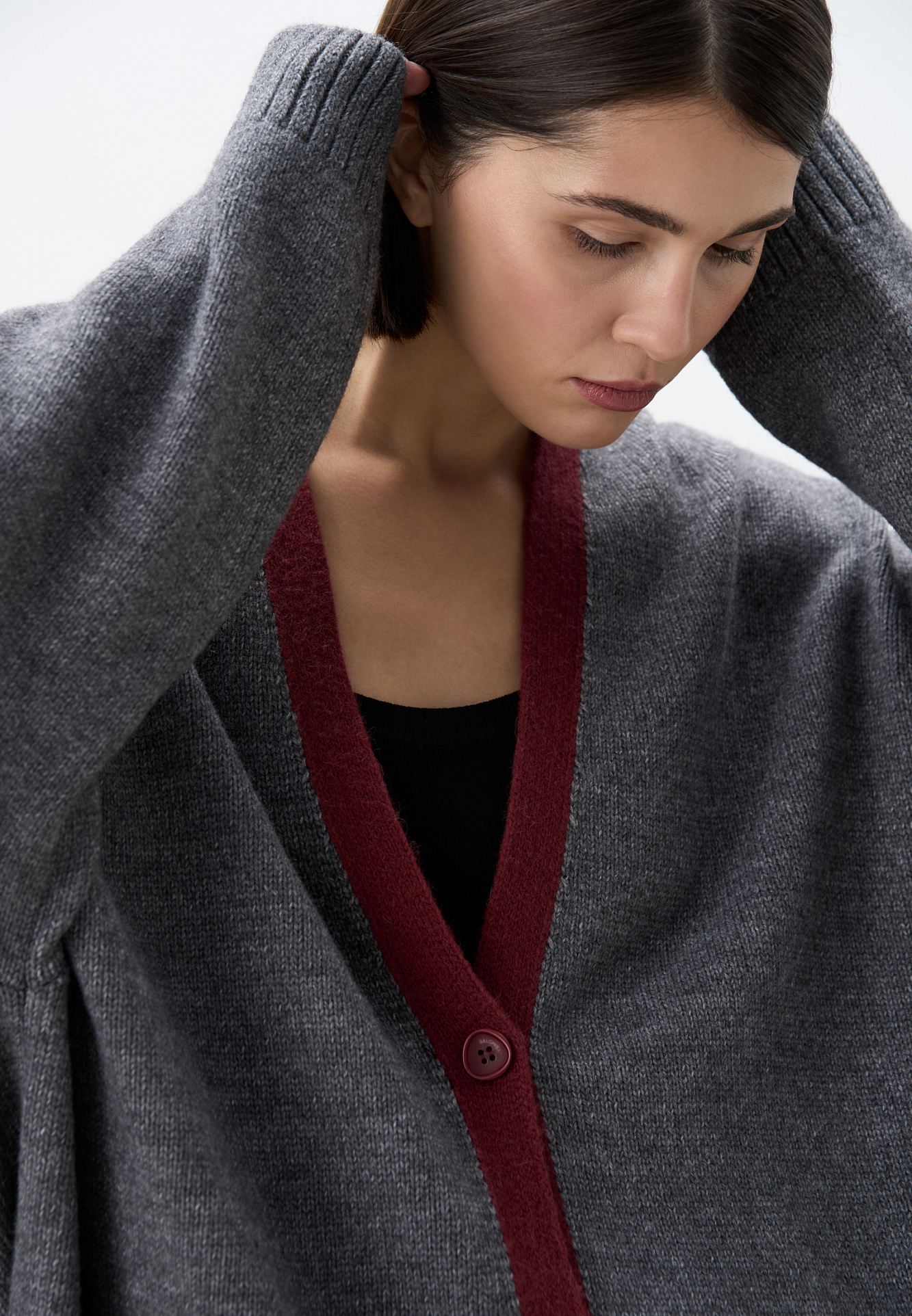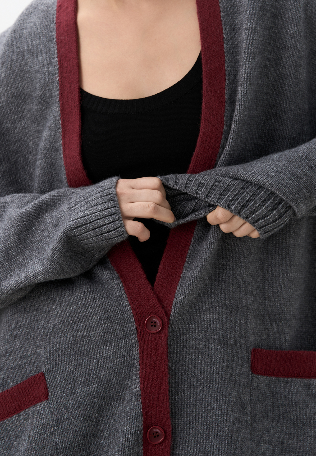 Трикотажный кардиган из шерсти альпака. Модель свободного силуэта, с длинными рукавами, спущенной линией плеч, V-образным вырезом, накладными карманами и застежкой на пуговицы. Изделие декорировано планкой и карманами контрастного цвета.