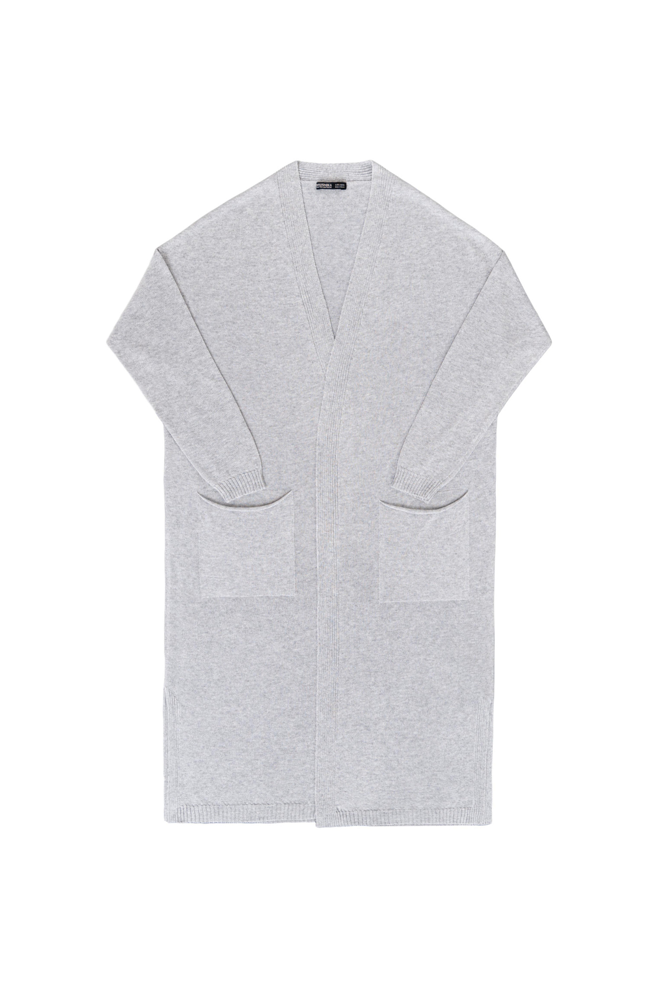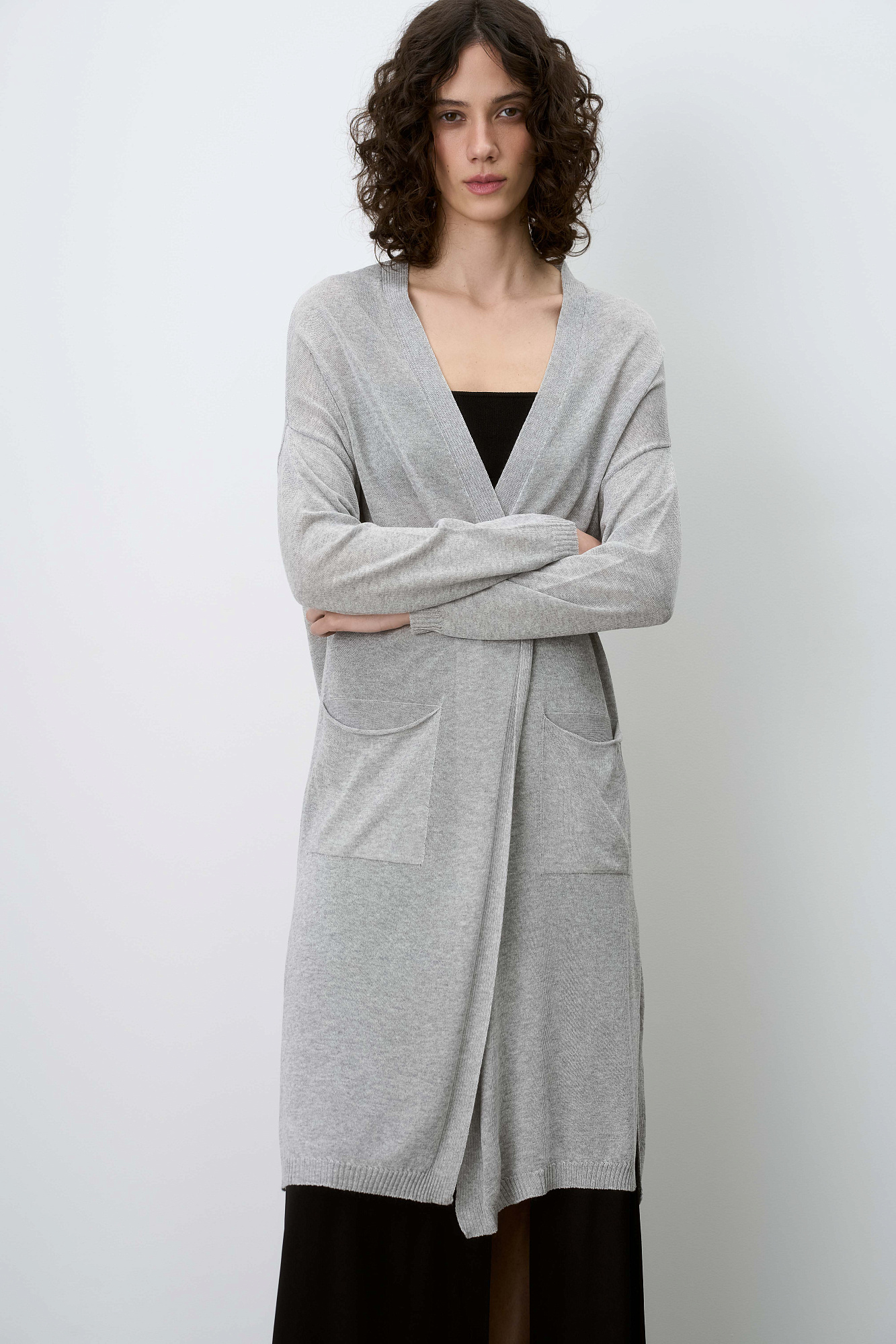 Длинный трикотажный кардиган из вискозы. Модель прямого кроя, с двумя боковыми карманами, шлевками на талии и поясом.