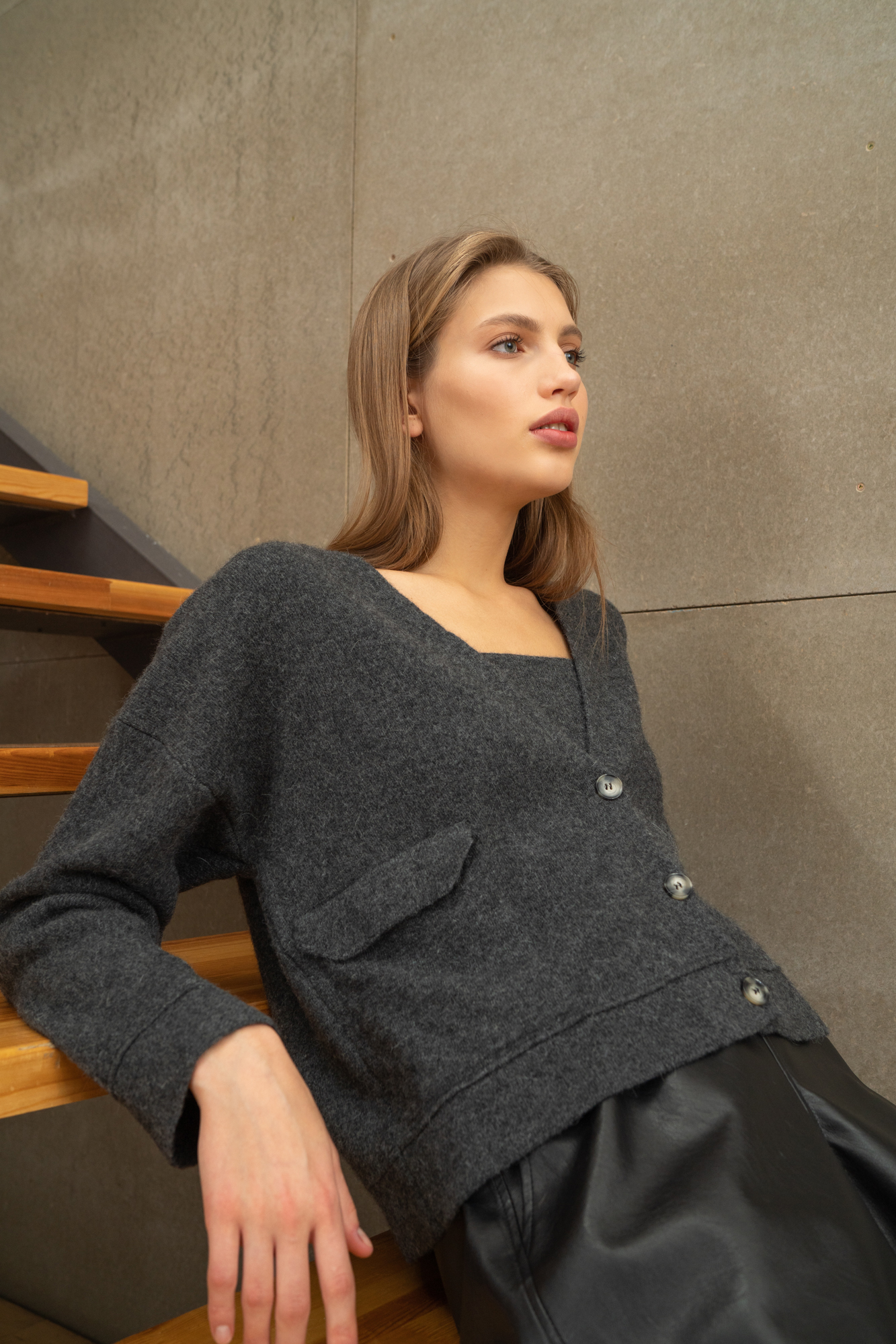 Трикотажный кардиган из шерсти альпака. Модель прямого кроя, с длинными рукавами и накладными карманами, застежка на пуговицы. В комплекте кроп-топ на тонких бретелях.