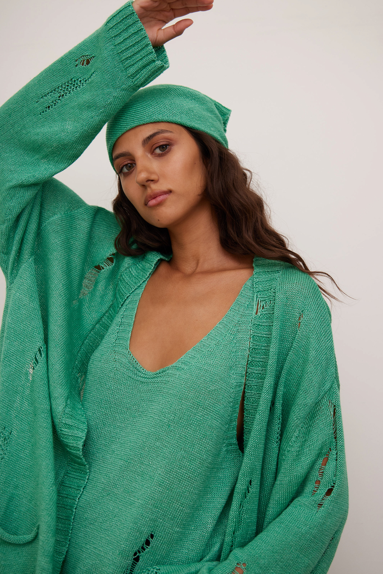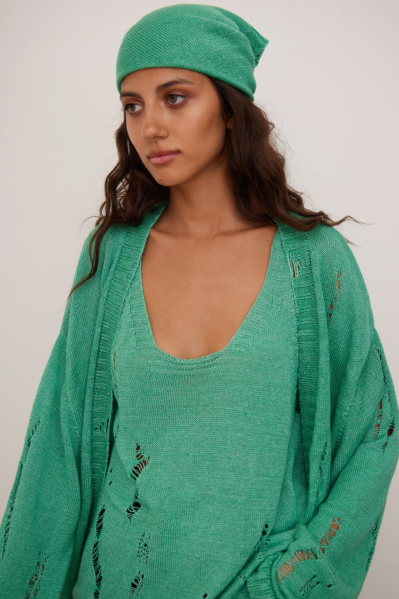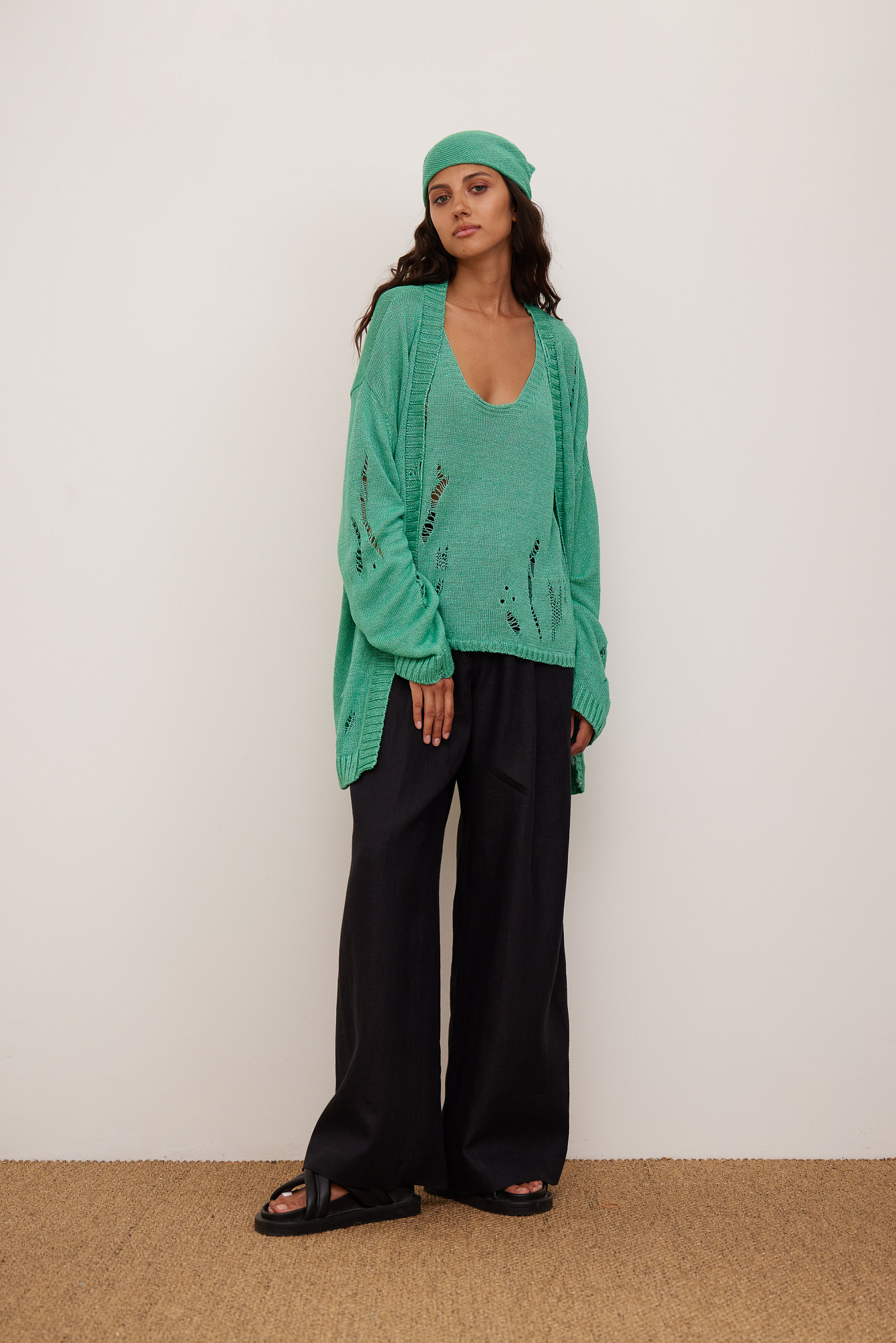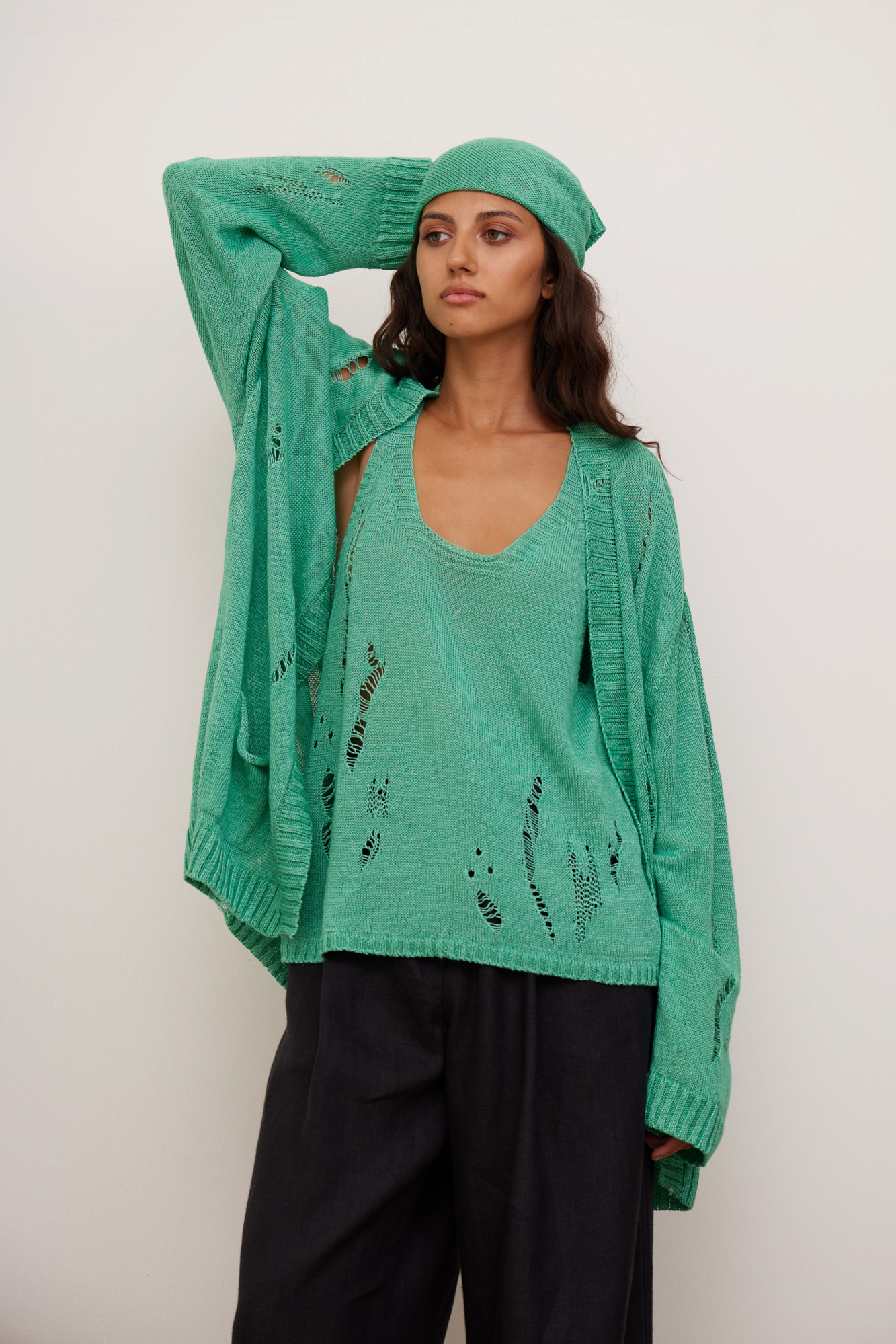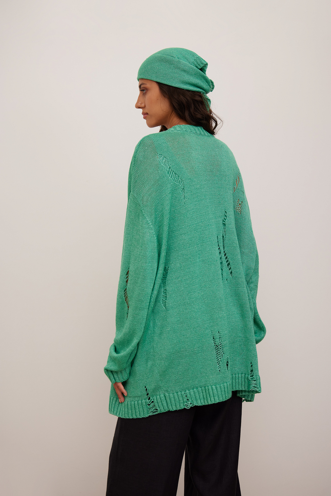 Кардиган из 100% льна с рваным узором. Дополнить образ можно топом.