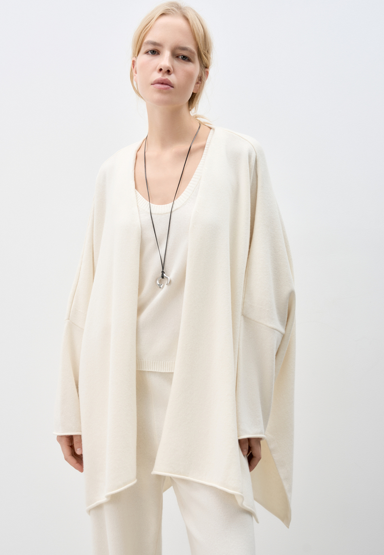 Трикотажный кардиган из шерсти и кашемира. Модель свободного кроя, с длинными широкими рукавами и спущенной линией плеч. Без застежки.