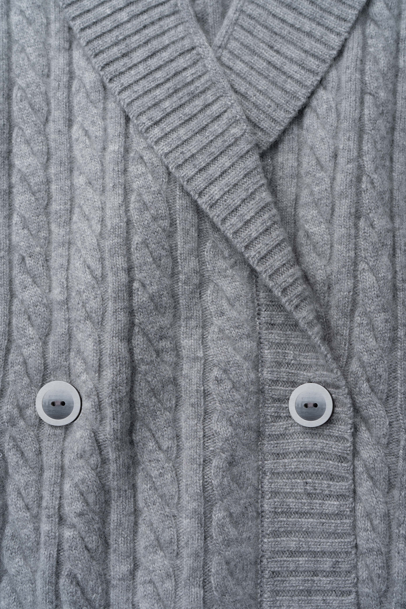 Трикотажный кардиган из кашемира и шерсти. Модель с отложным воротником и большими накладными карманами. Края изделия выполнены в широкий рубчик.