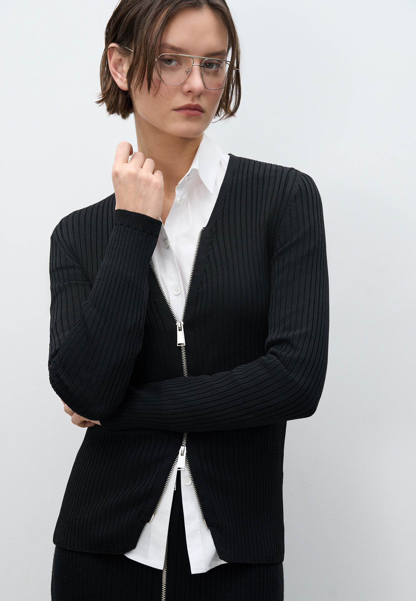 Трикотажный кардиган на молнии из вискозы. Модель прямого силуэта, с длинными рукавами и V-образным вырезом. Изделие выполнено в широкий рубчик.