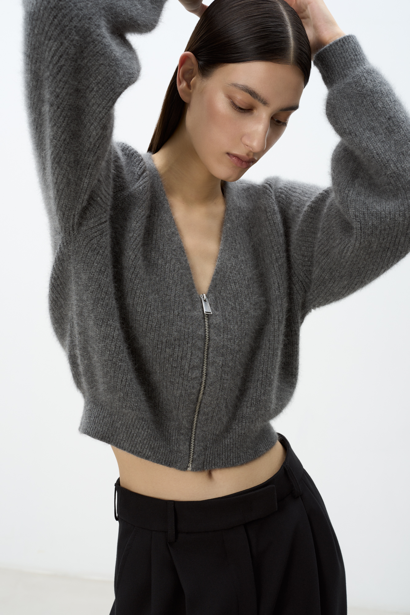 Укороченный кардиган на молнии с V-образным вырезом. Содержание в пряже 40% натурального пуха лисы делает изделие теплым, мягким и в тоже время очень легким.