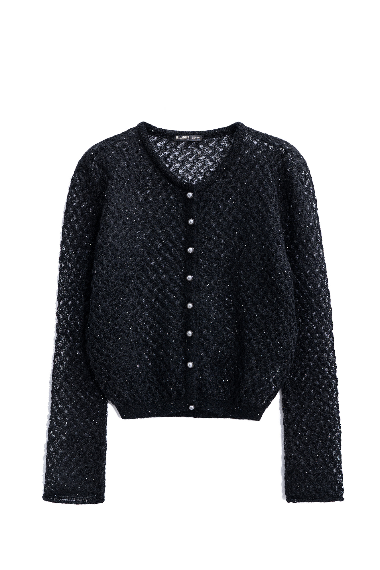 Трикотажный ажурный кардиган из кидмохера, декорированный мелкими пайетками. Модель свободного силуэта с длинными рукавами, круглым вырезом горловины и застежкой на жемчужные пуговицы.