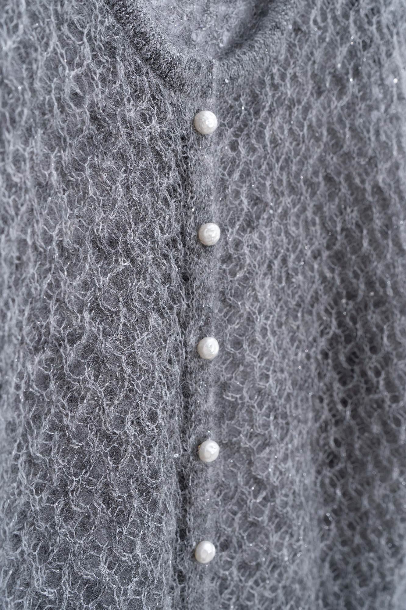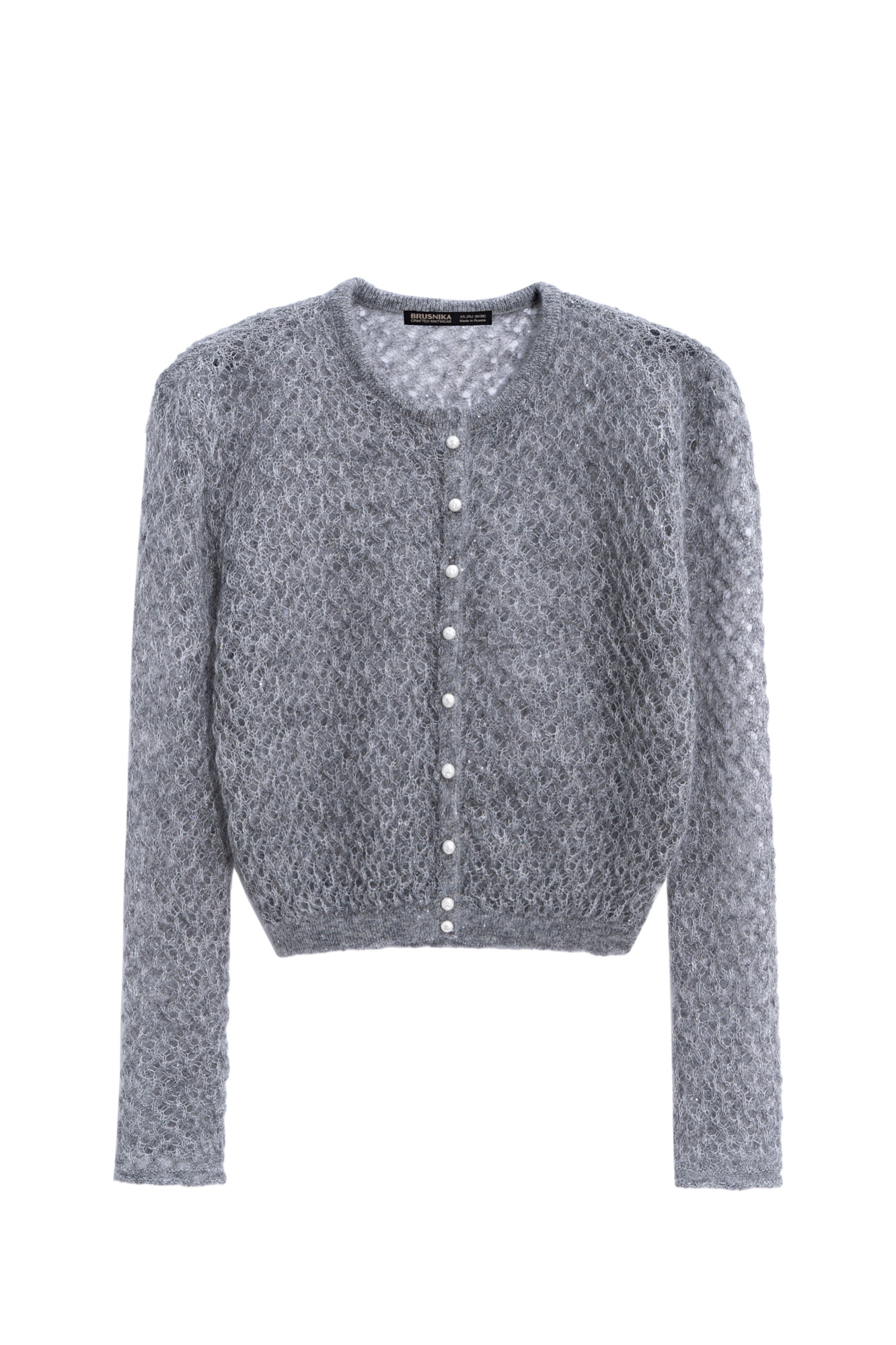 Трикотажный ажурный кардиган из кидмохера, декорированный мелкими пайетками. Модель свободного силуэта с длинными рукавами, круглым вырезом горловины и застежкой на жемчужные пуговицы.