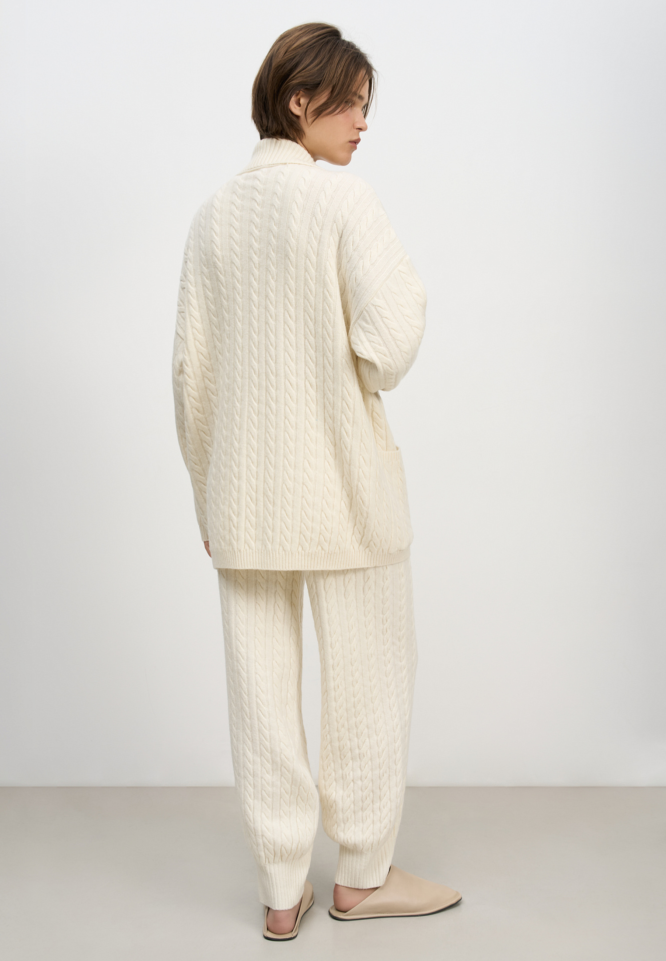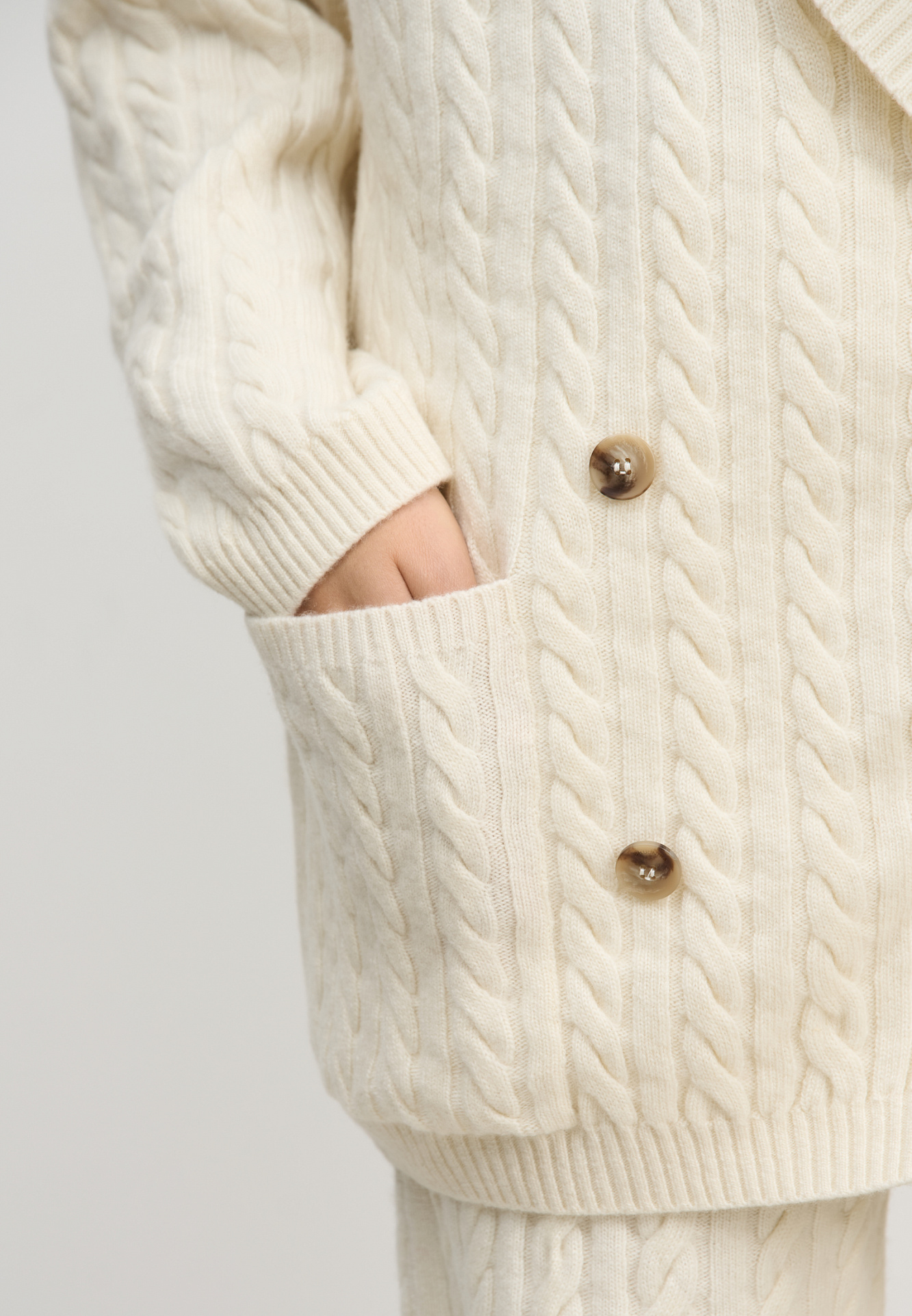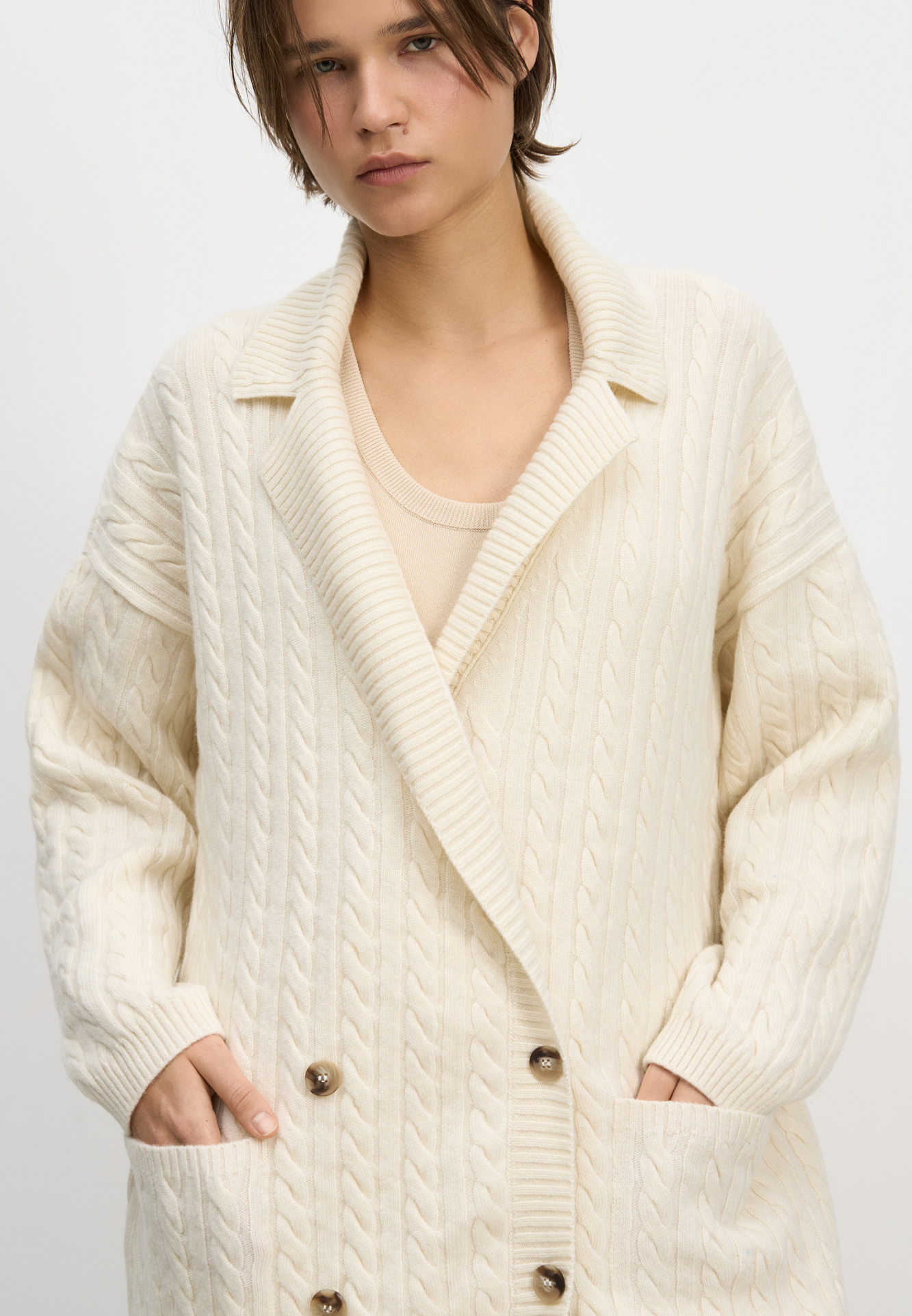 Трикотажный кардиган из кашемира и шерсти. Модель с отложным воротником и большими накладными карманами. Края изделия выполнены в широкий рубчик.