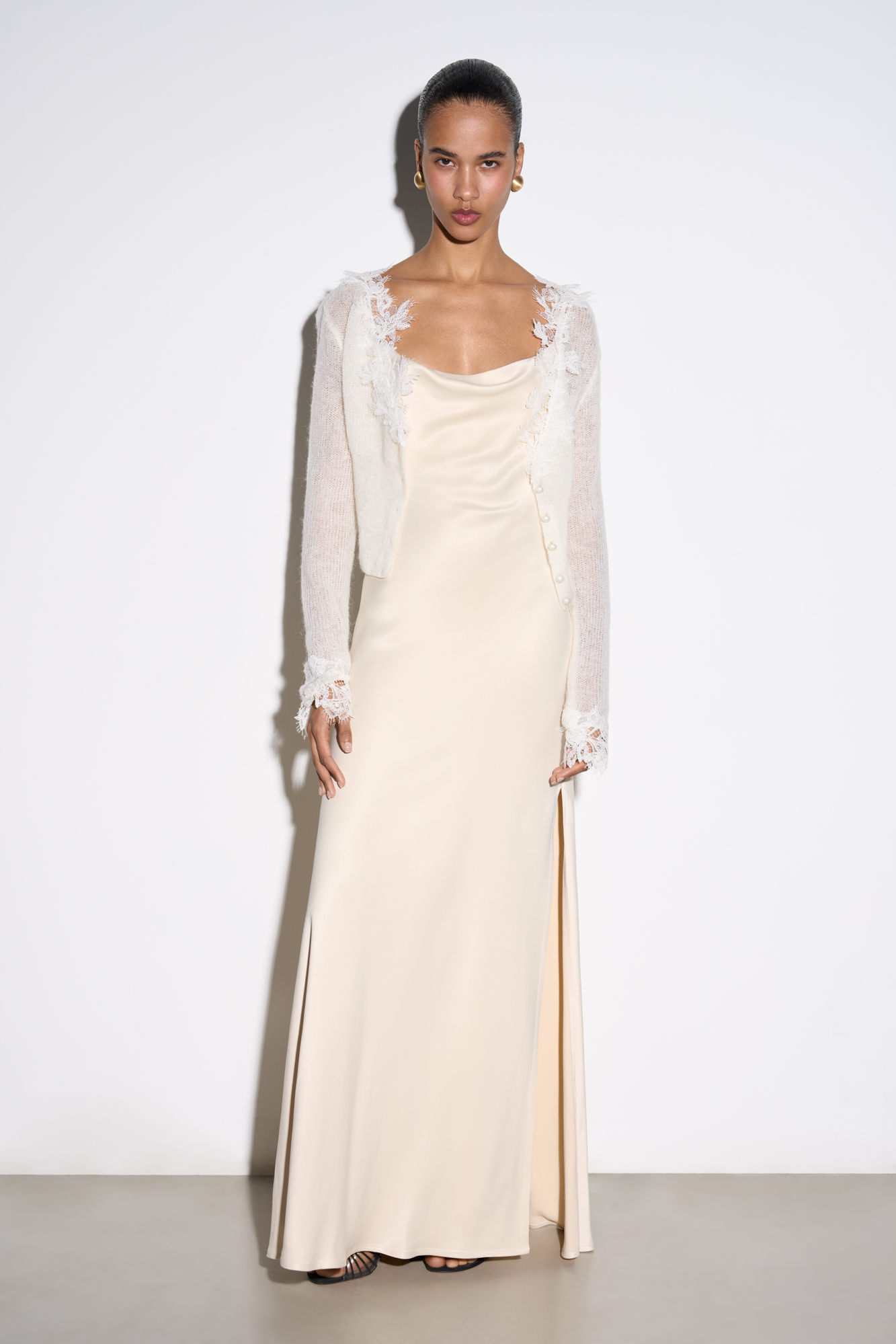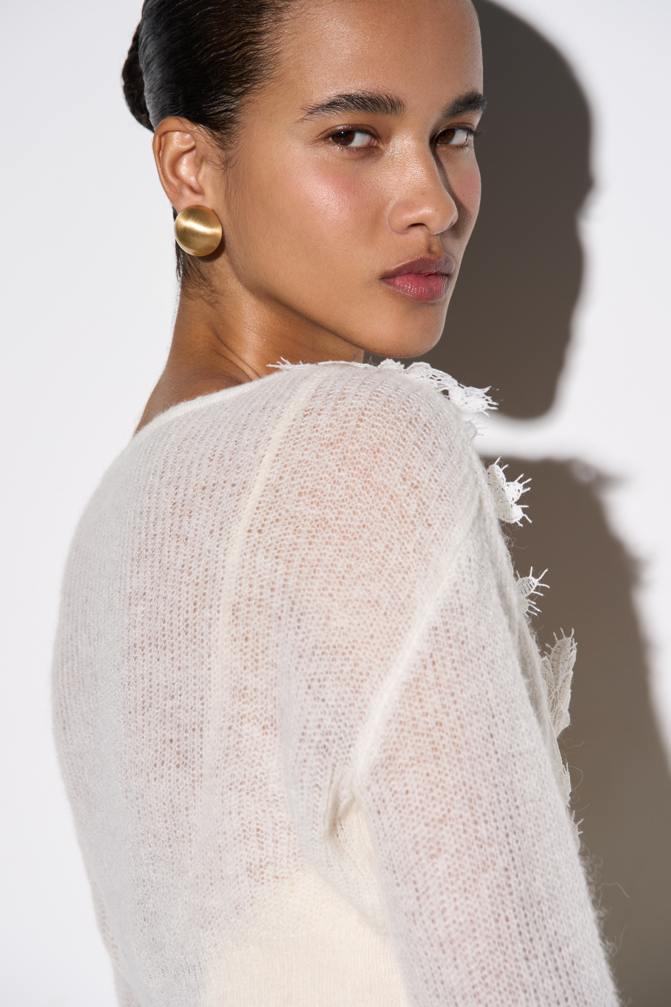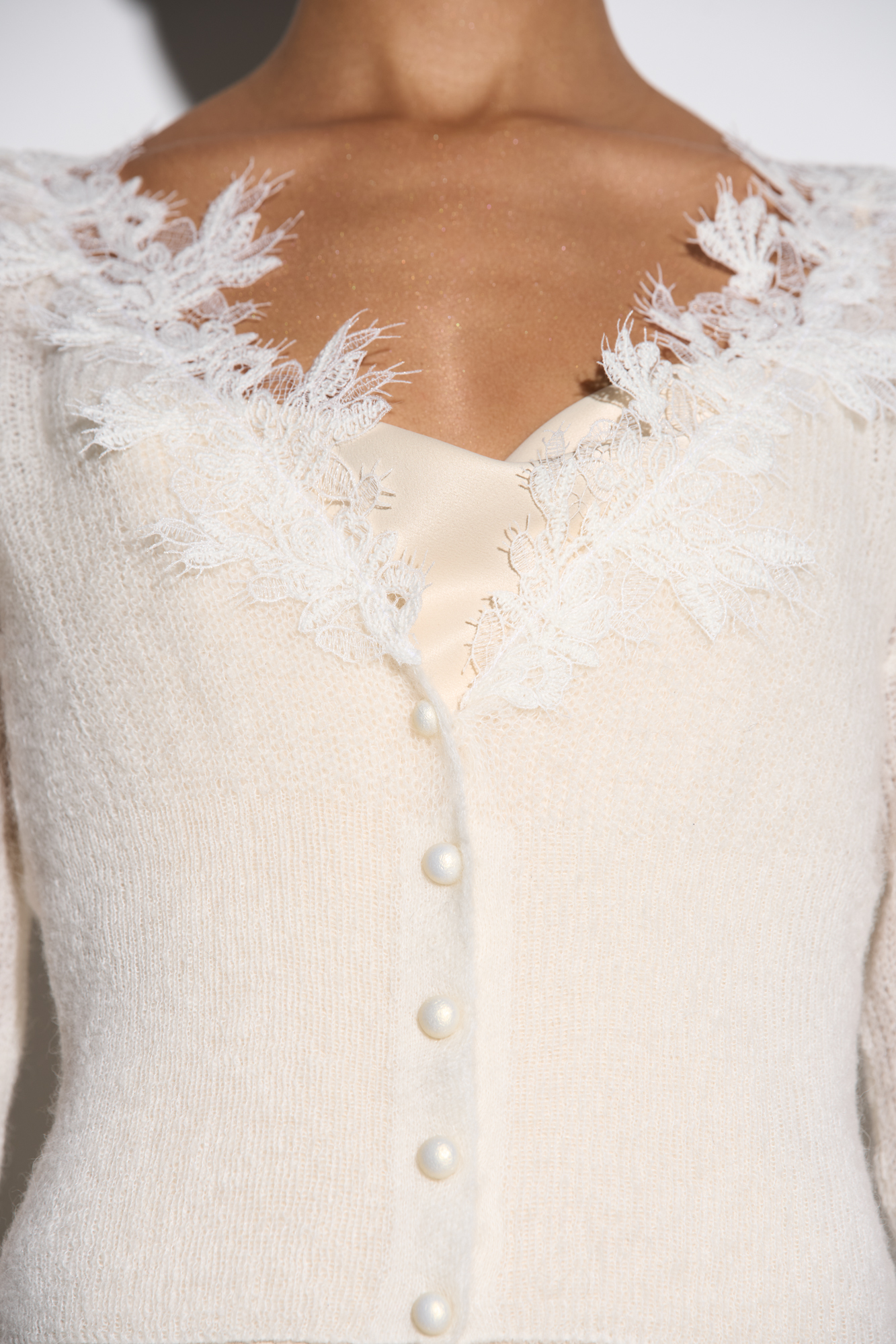 Короткий трикотажный кардиган из тонкой шерсти мериноса экстрафайн и альпака экстрафайн. Модель по фигуре с глубоким V-образным вырезом. Застежка на маленькие жемчужные пуговицы. Изделие декорировано тонким кружевом.