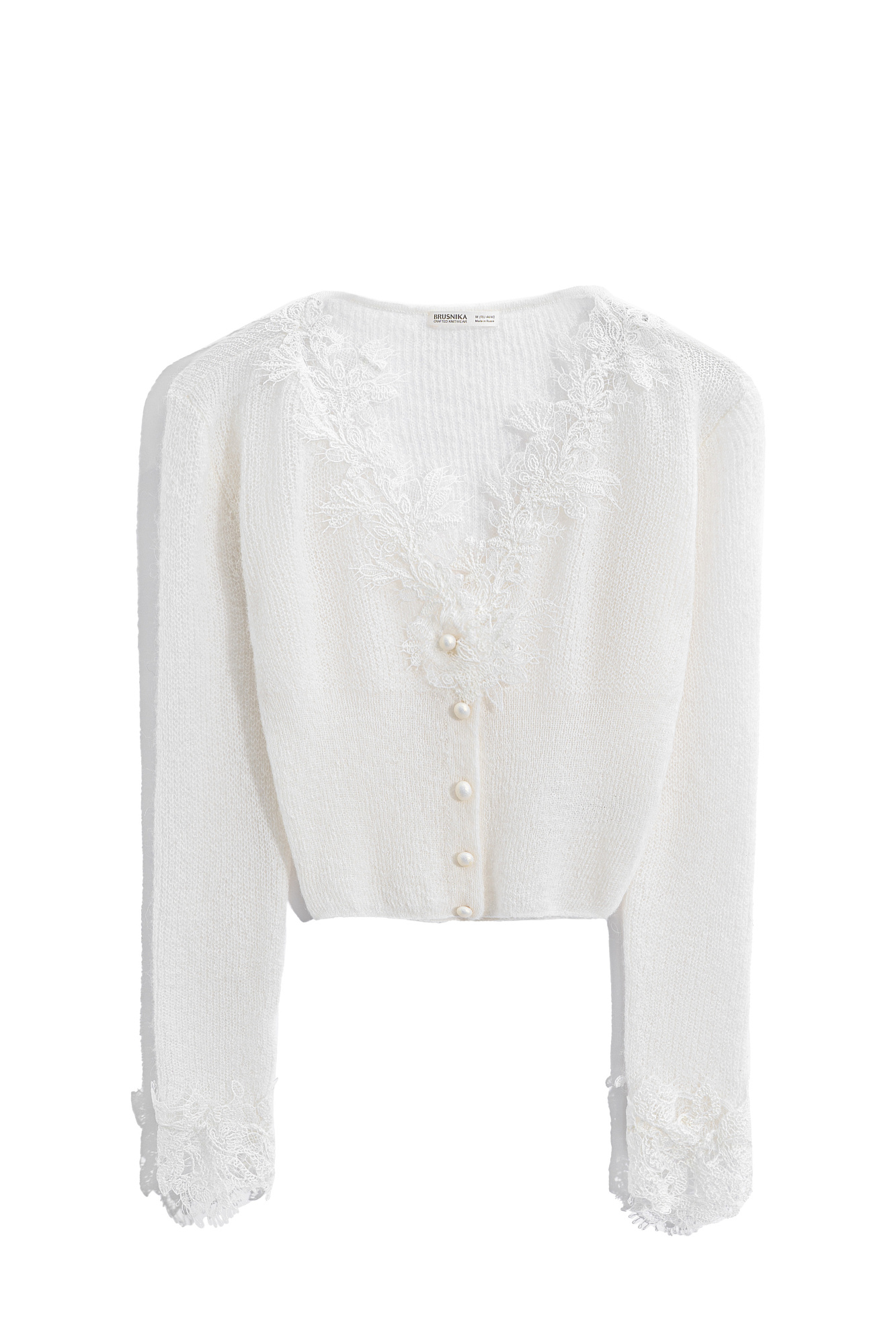 Короткий трикотажный кардиган из тонкой шерсти мериноса экстрафайн и альпака экстрафайн. Модель по фигуре с глубоким V-образным вырезом. Изделие декорировано тонким кружевом. Застежка на маленькие жемчужные пуговицы.