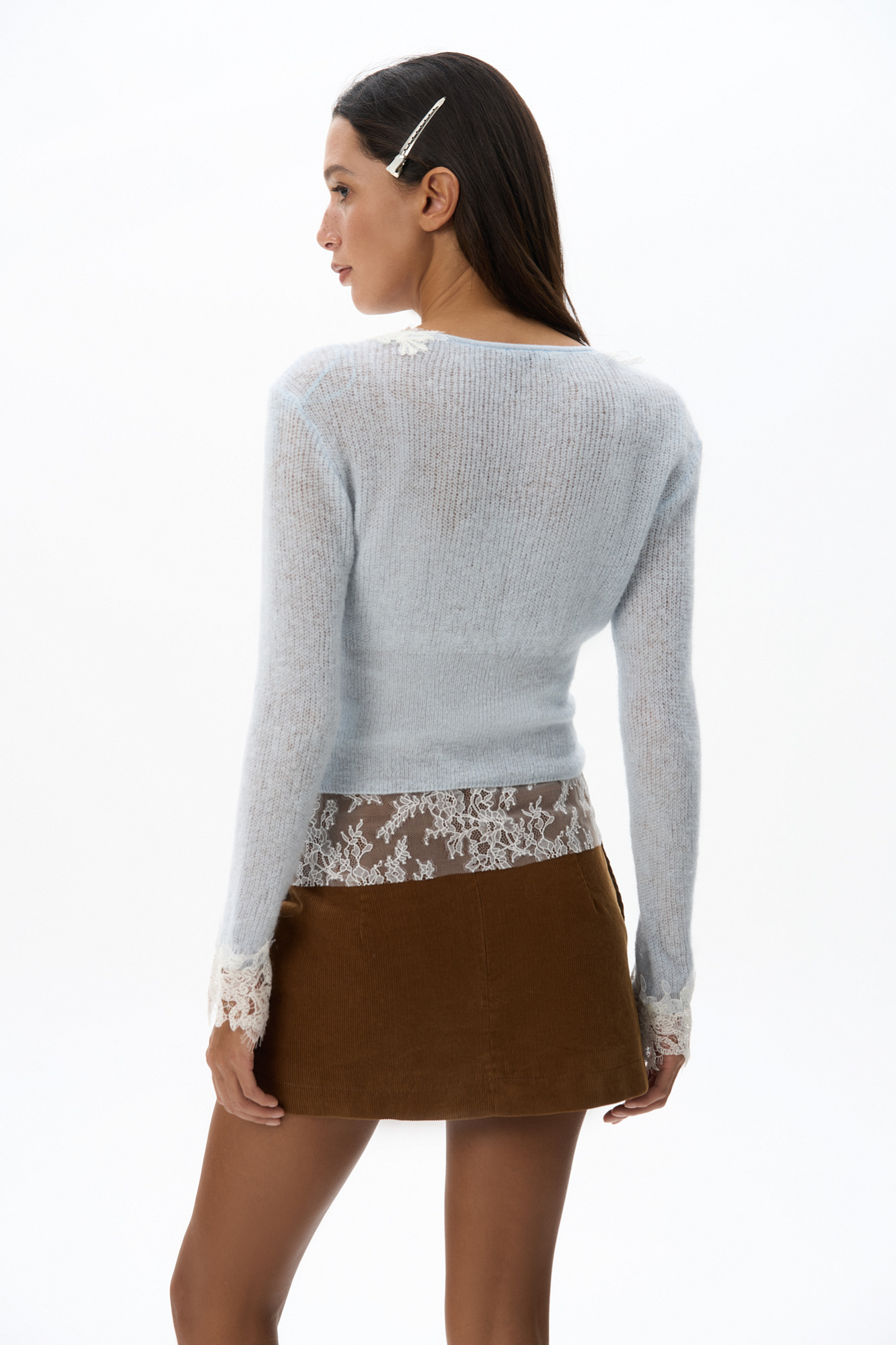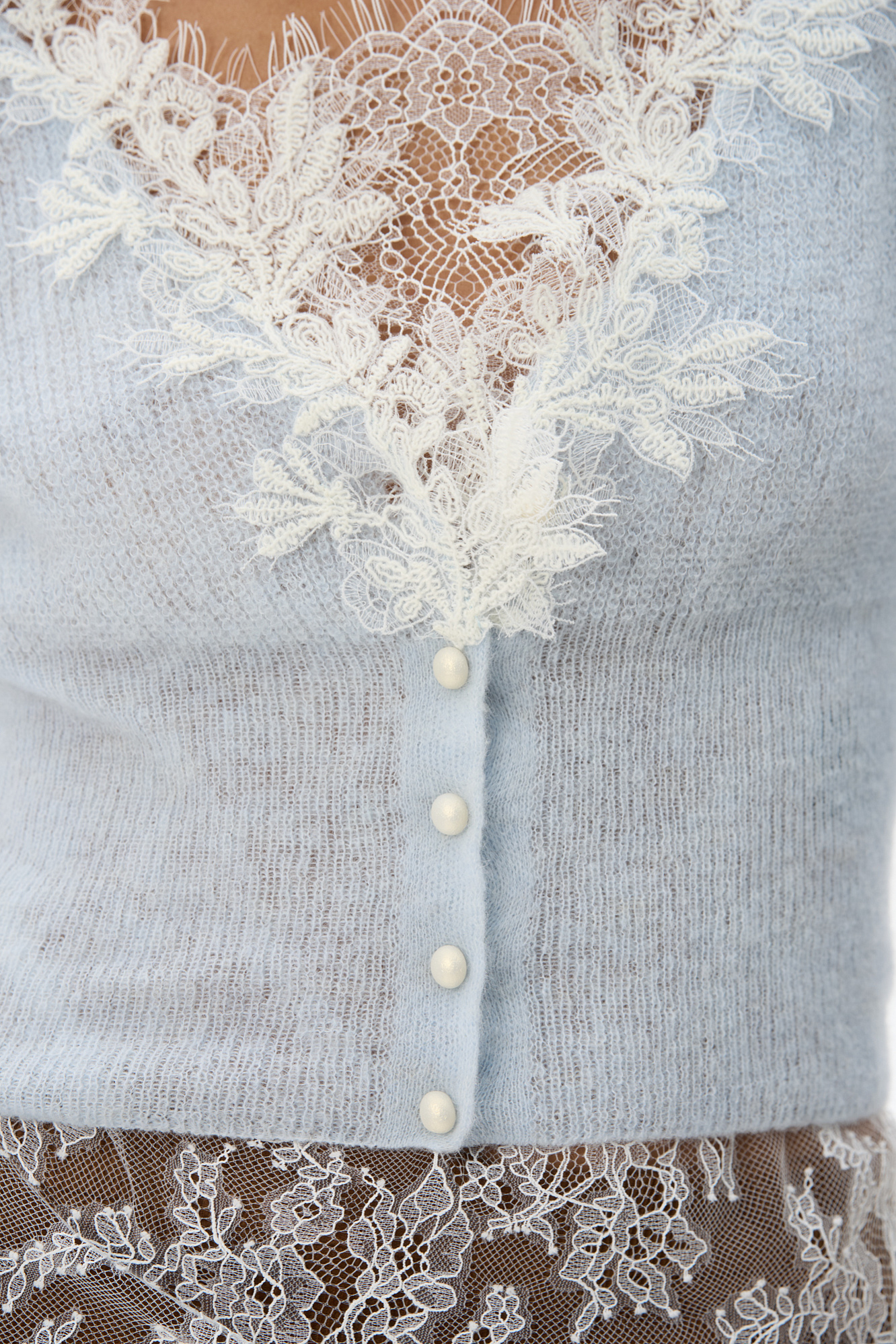 Короткий трикотажный кардиган из тонкой шерсти мериноса экстрафайн и альпака экстрафайн. Модель по фигуре с глубоким V-образным вырезом. Изделие декорировано тонким кружевом. Застежка на маленькие жемчужные пуговицы.
