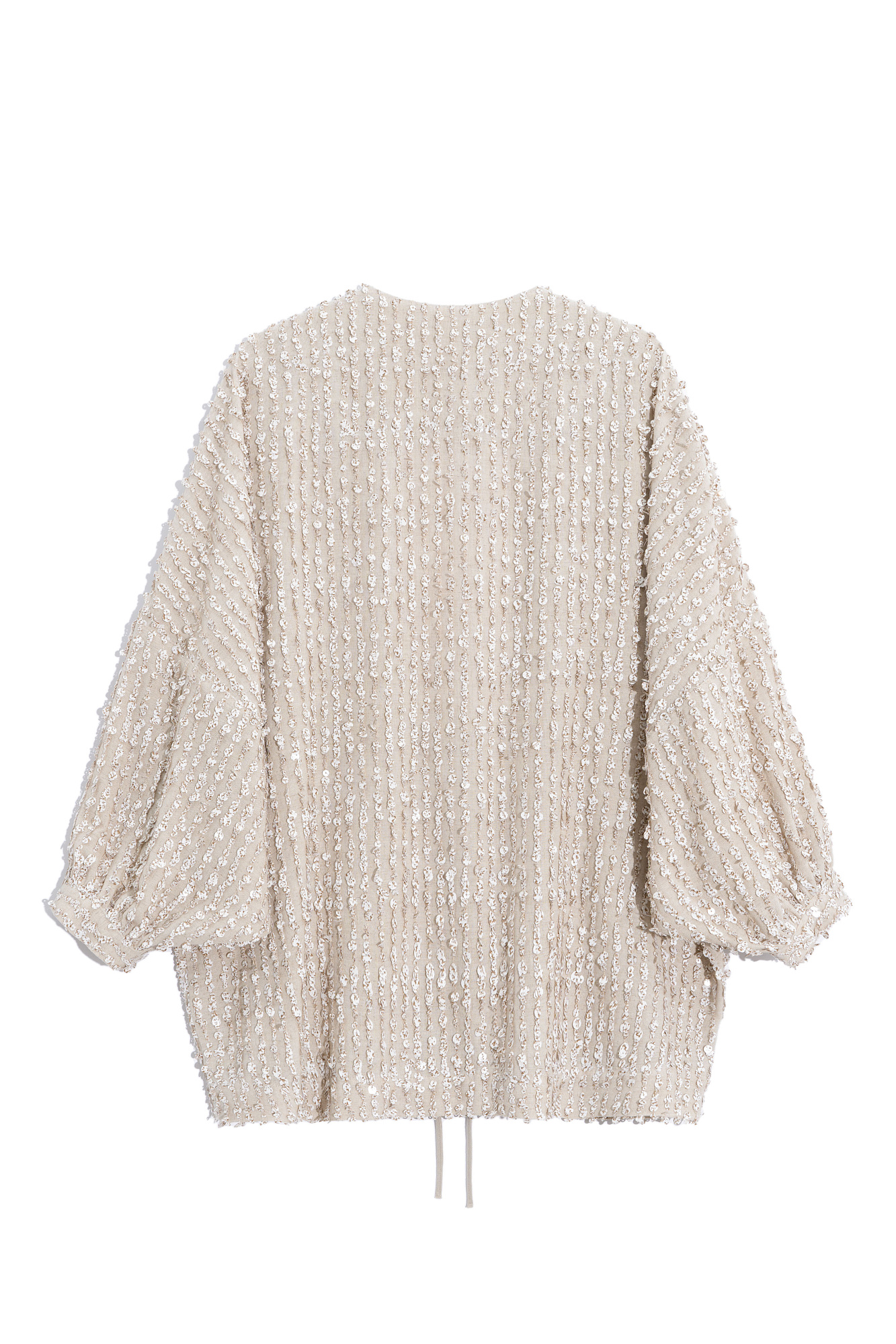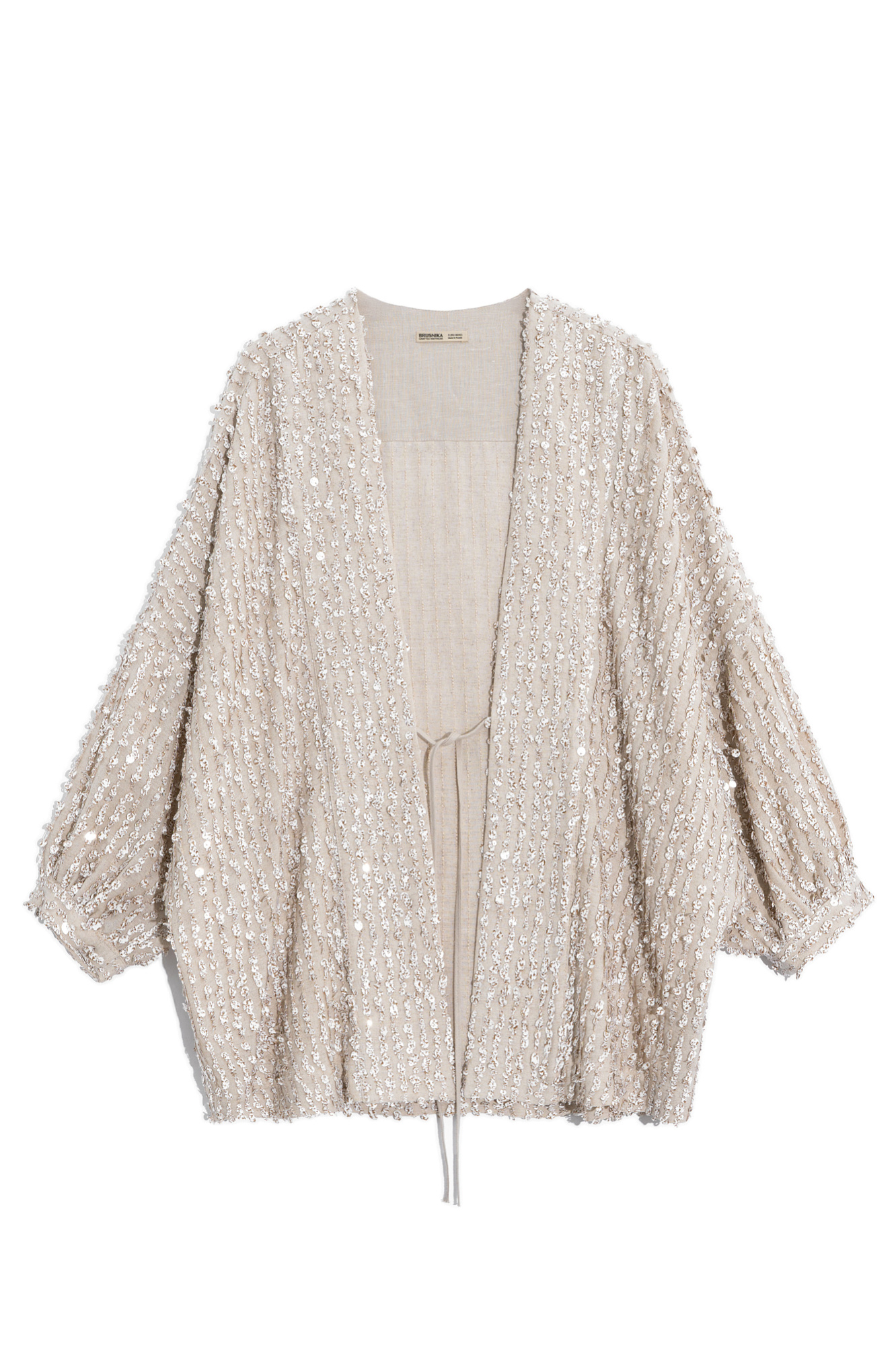 Кардиган-халат изо льна. Модель свободного кроя на запах с тонким поясом. Изделие декорировано пайетками.