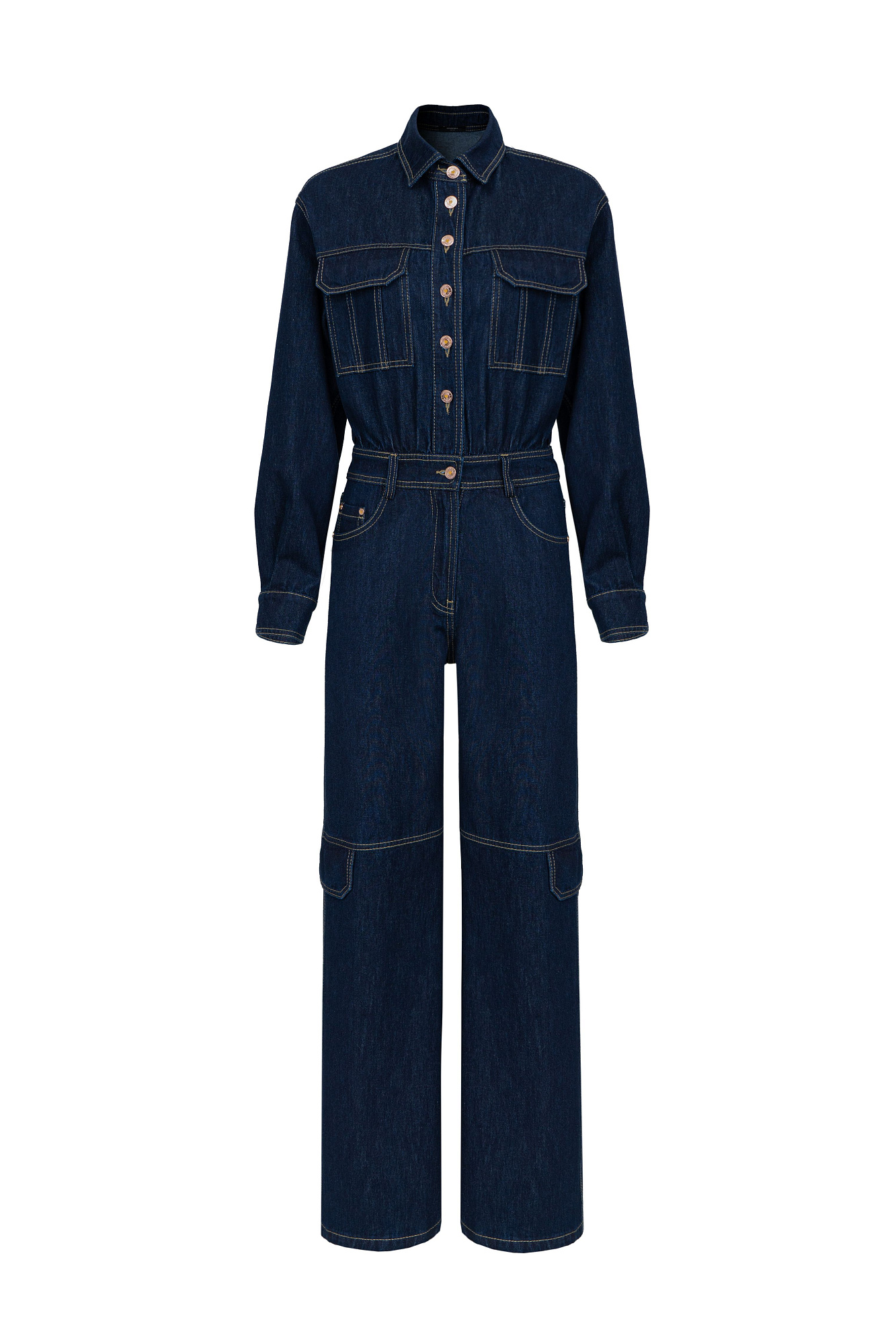 Джинсовый комбинезон из денима. Длинные рукава с манжетами. Отложной воротник. Передние накладные карманы на груди, боковые карманы и накладные карманы сзади. На поясе штрипки под ремень. Застежка на молнию и металлические пуговицы.