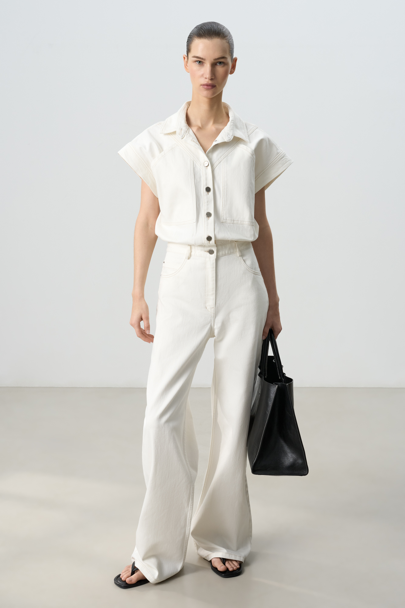 Джинсовый комбинезон из 100% хлопка. Рубашечный верх с коротким рукавом, отложным воротником и нагрудными карманами. Брюки изделия широкие, прямые, полной длины, с карманами и шлевками на поясе для ремня. Застежка на пуговицы по всей длине и молнию. Модель декорирована объемными швами и потертостями. Оттенок может отличаться от фото.