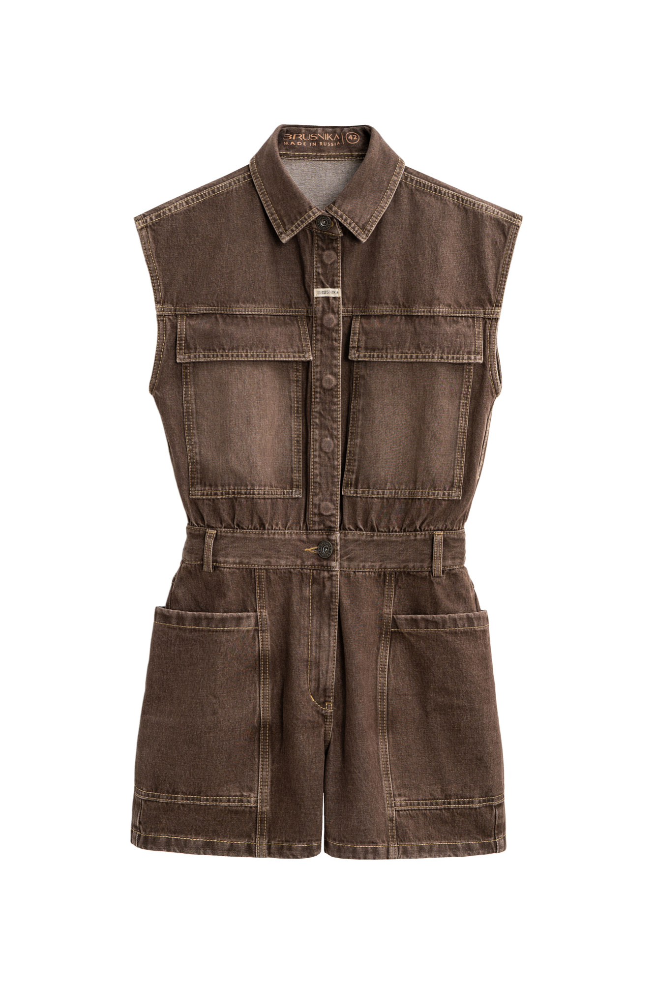 Джинсовый комбинезон из 100% хлопка. Модель с рубашечным верхом и шортами. Изделие с классическим отложным воротником, короткими рукавами-крылышками и застежкой на металлические пуговицы, шлевками на поясе для ремня и большими накладными карманами.