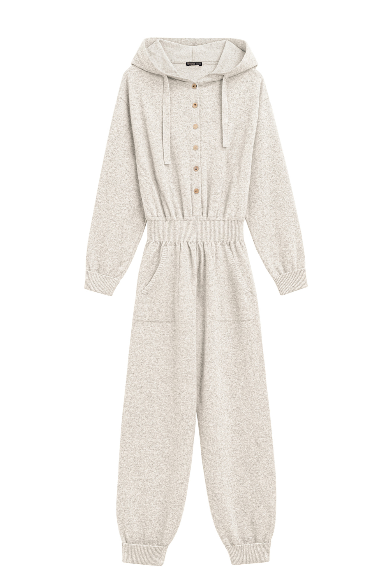 Трикотажный комбинезон из шерсти и кашемира, состоящий из худи и брюк. Худи с капюшоном и застежкой на пуговицы, брюки с широким эластичным поясом, боковыми карманами и манжетами на резинке.