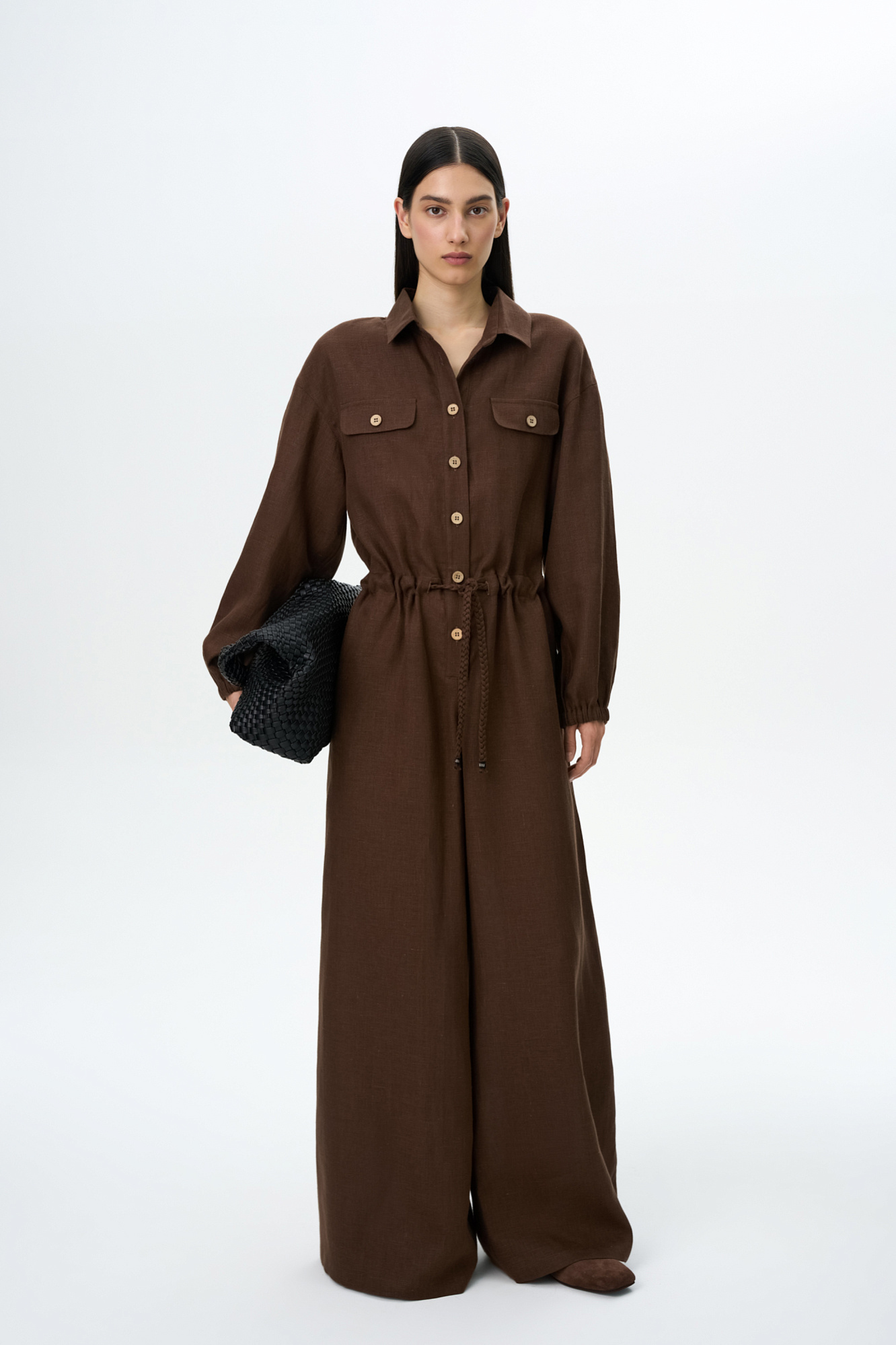 Комбинезон из 100% льна с накладными карманами на груди, длинным рукавом. Застежка на пуговицы.